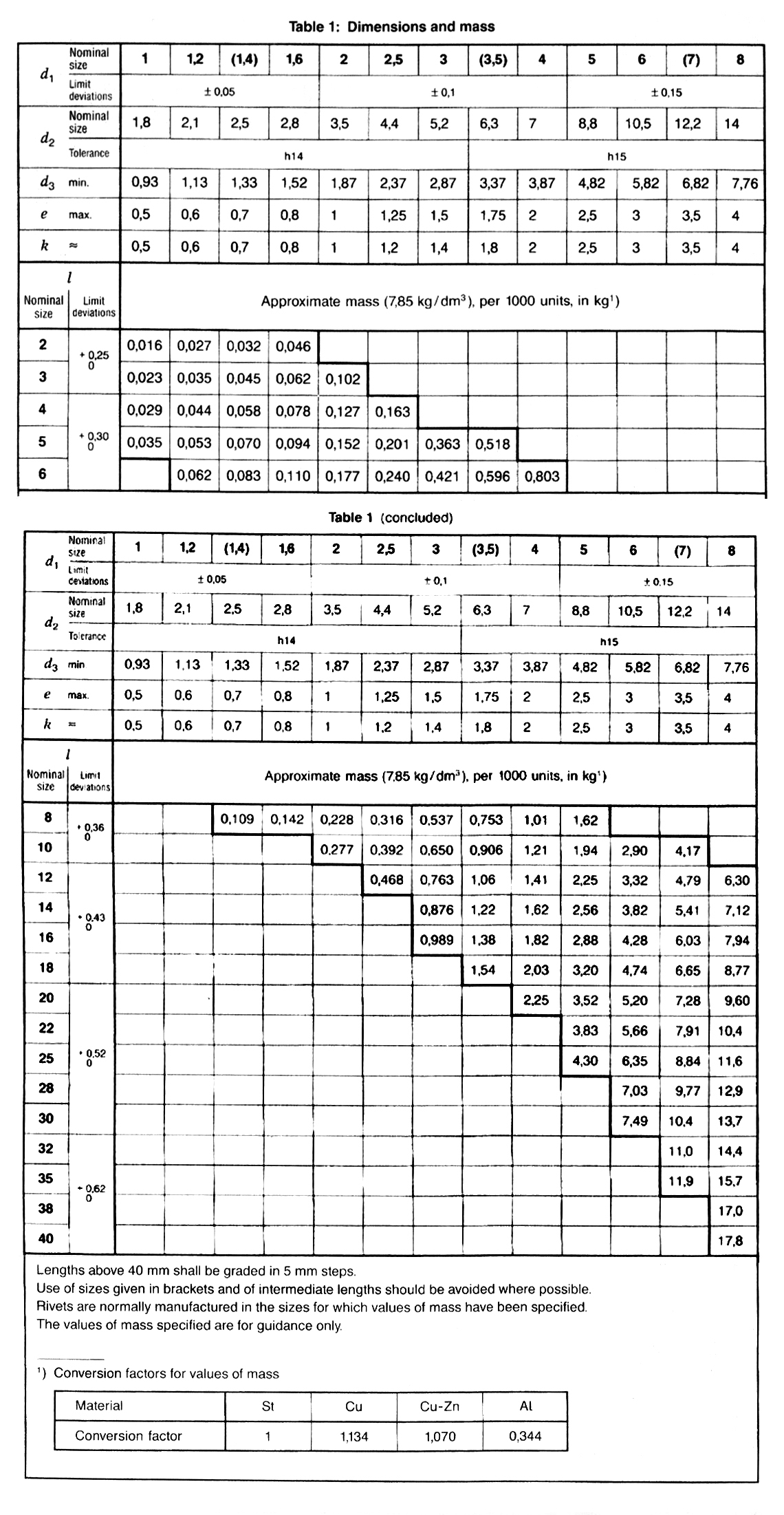 Countersunk head rivets with nominal diameters from 1 to 8 mm