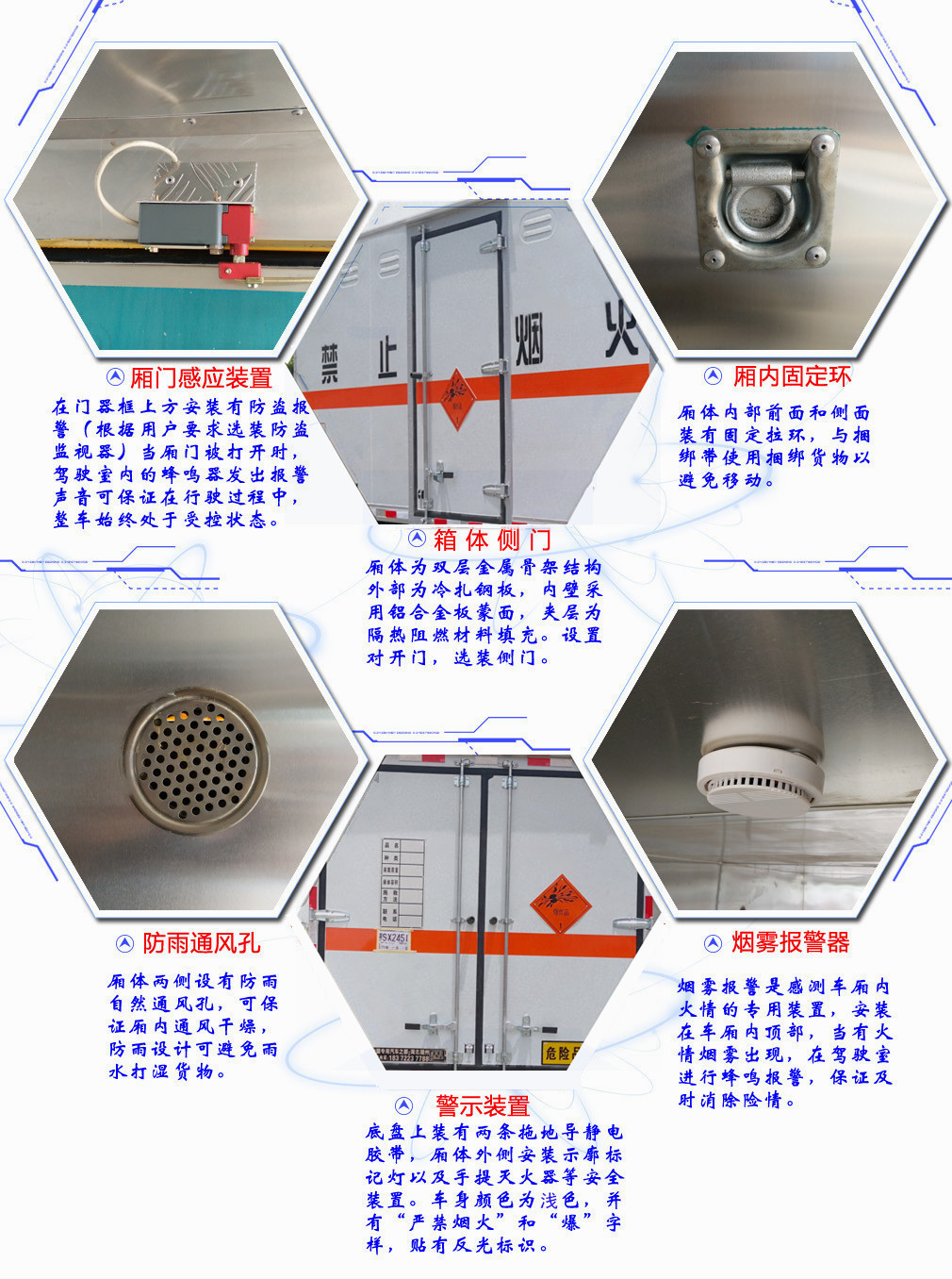 廂體內尺寸:7650,6800,6200*2400*2400,1950該車用于運輸具有獨立容器(瓶)包裝的危險品貨物類項號:1.1 D,1.1B,1.1G ,1.1C,1.3C,1.4G;運送危險貨物車輛的類型:EX/Ⅲ型車輛