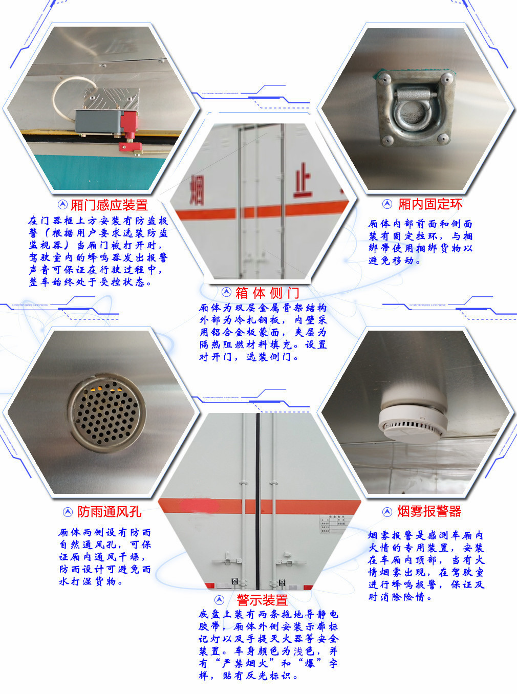 該車適用于運輸危險品為危險品運輸車;運輸獨立容器(瓶)包裝的貨物;EX/Ⅲ型車輛;危險貨物類項號:1.1D,1.1D,1.1B,1.1D,1.4G.1.4G。