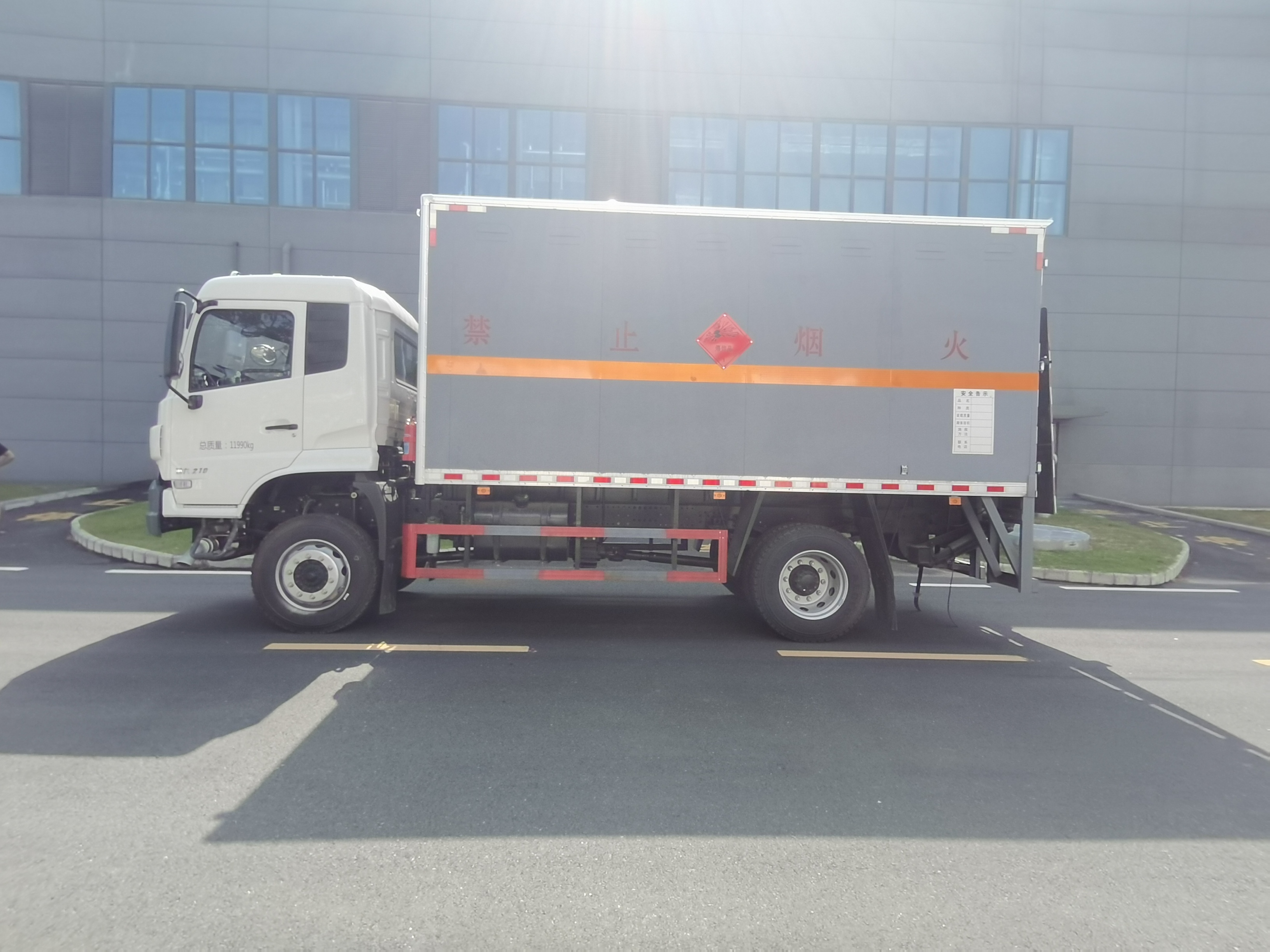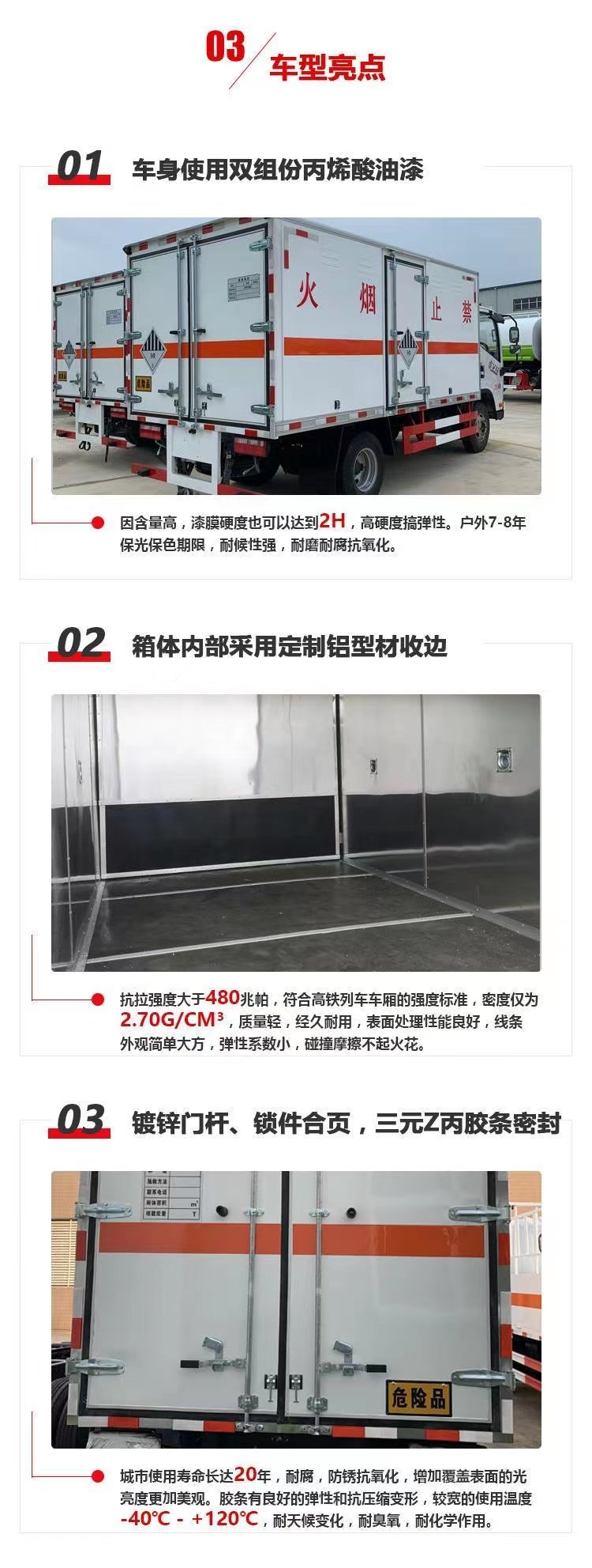 該車為危險品運輸車.廂體頂部封閉,不可開啟.隨底盤選裝駕駛室.運送爆炸品的類項號:1.1D,1.1B,1.1G,1.1C,1.4G,1.4B,1.3C.危險貨物運輸車種類:EX/Ⅲ.選裝側(cè)開門型式及位置,選裝不開側(cè)門,廂體選裝開百葉窗,選裝后部樣式.液壓尾板收起水平長度:300mm,尾板質(zhì)量為450kg,后部安裝液壓尾板時側(cè)、后防護材料為Q235,側(cè)防護焊接連接,后防護螺栓加焊接連接,后防護截面高100mm,截面寬50mm,下邊緣離地高490mm;選裝后部不帶尾板時后防護材料:Q235,連接方式為焊接,后防護截面高100mm,截面寬50mm,下邊緣離地高490mm.僅采用排氣管前置,子午胎,限速裝置,輔助制動裝置和前輪盤式制動器的底盤;限速80km/h.安裝具有衛(wèi)星定位功能的行駛記錄儀;ABS型號/生產(chǎn)廠家:ABS 8/東科克諾爾商用車制動系統(tǒng)(十堰)有限公司.發(fā)動機/油耗值對應(yīng)有關(guān)系(L/100km):D4.5NS6B210/16.82,D4.5NS6B220/16.82,轉(zhuǎn)向軸已安裝防爆胎裝置.選裝ETC車載裝置. |