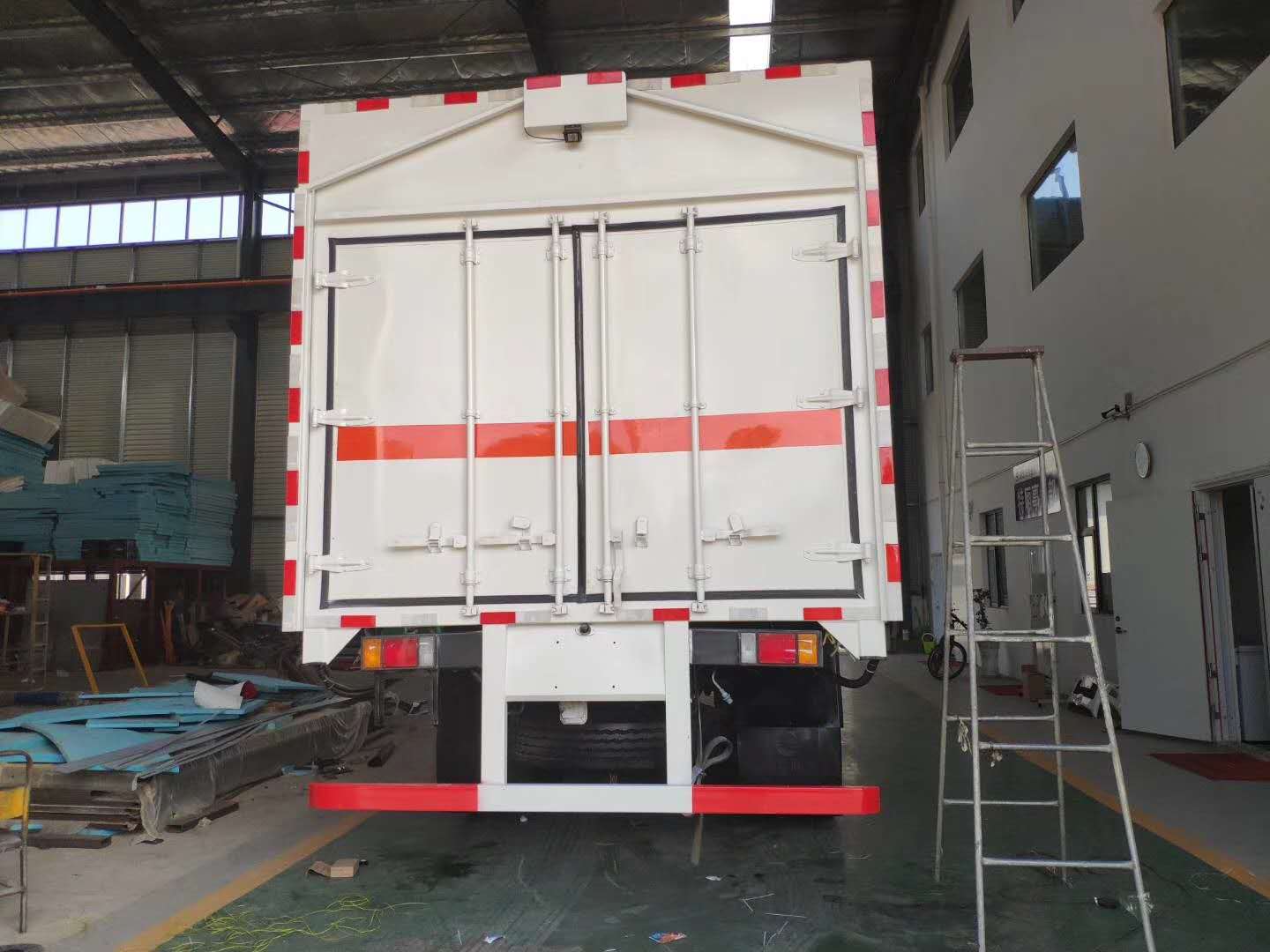 2)上裝配置:外板采用1.2MM厚冷軋板有一次沖壓成型的百葉窗,內飾為導電性能良好的鋁板有透氣孔,內襯為矩形管骨架牢靠穩定,內部填充為透氣防潮阻燃的擠塑板,四種材料經過現代工藝復合而成。內部有固定貨物的防撞護板,該車配有車載專用煙霧報警器及后門防盜器,配有液體收集箱及液位報警裝置,有靜電帶、滅火器、防火罩。整車國標反光標示及警告標志。