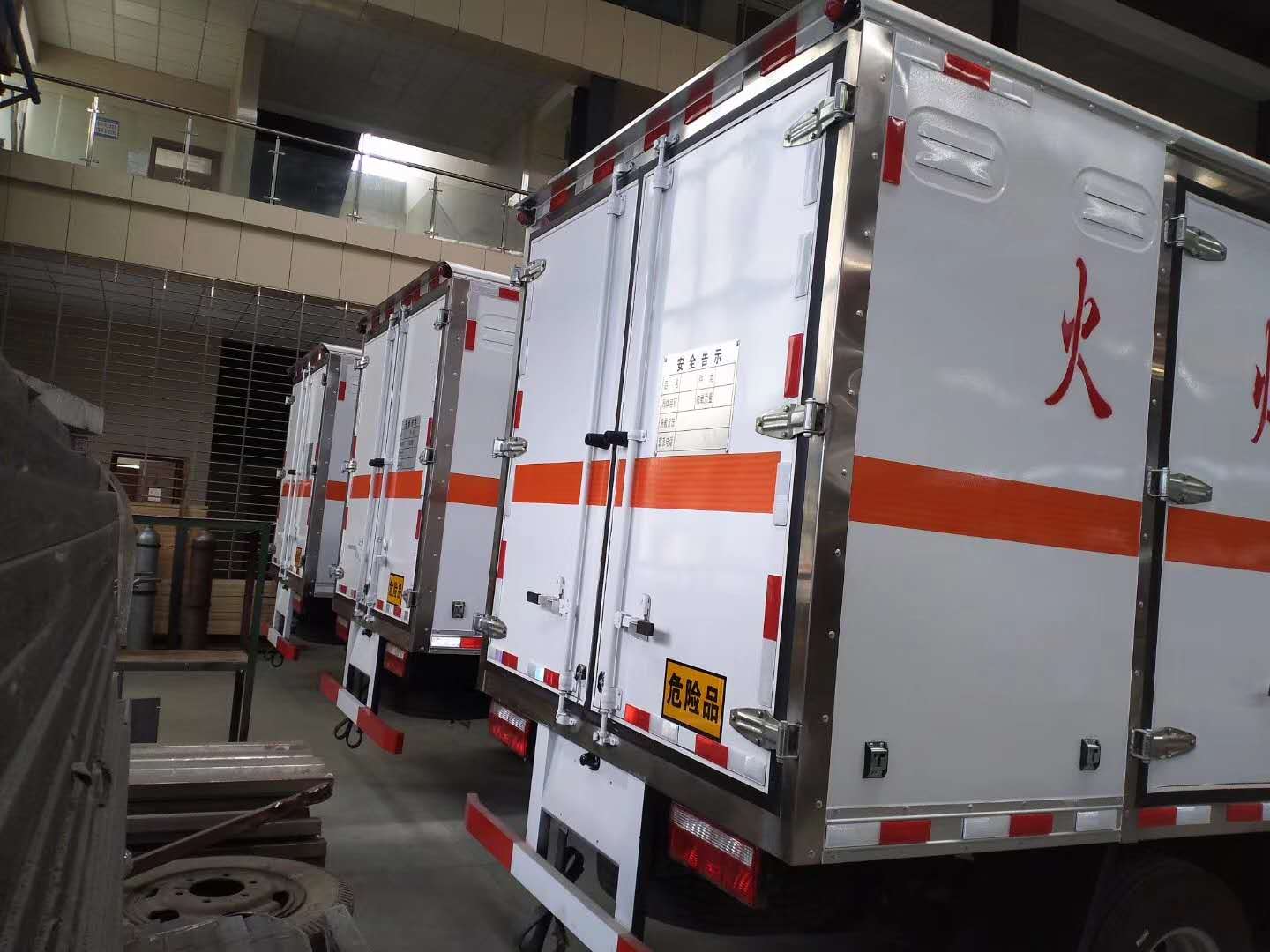 解放三類易燃液體廂式運輸車嚴格按照公告尺寸制作,外板采用1mm厚冷軋板有一次性成型的百葉窗,內飾為導電性能良好的鋁板有透氣孔,內襯為矩形管骨架牢靠穩(wěn)定,內部填充為透氣防潮阻燃的擠塑板,四種材料經現代工藝復合而成,廂體外部上下鋁合金型材包邊,底板和車廂前下部鋪橡膠皮,后門雙開,右側中部單開門,車輛外部有靜電帶、滅火器、防火罩,車廂內安裝煙霧報警器和門防盜報警器,嚴格按照國家危險品相關法規(guī)張貼。