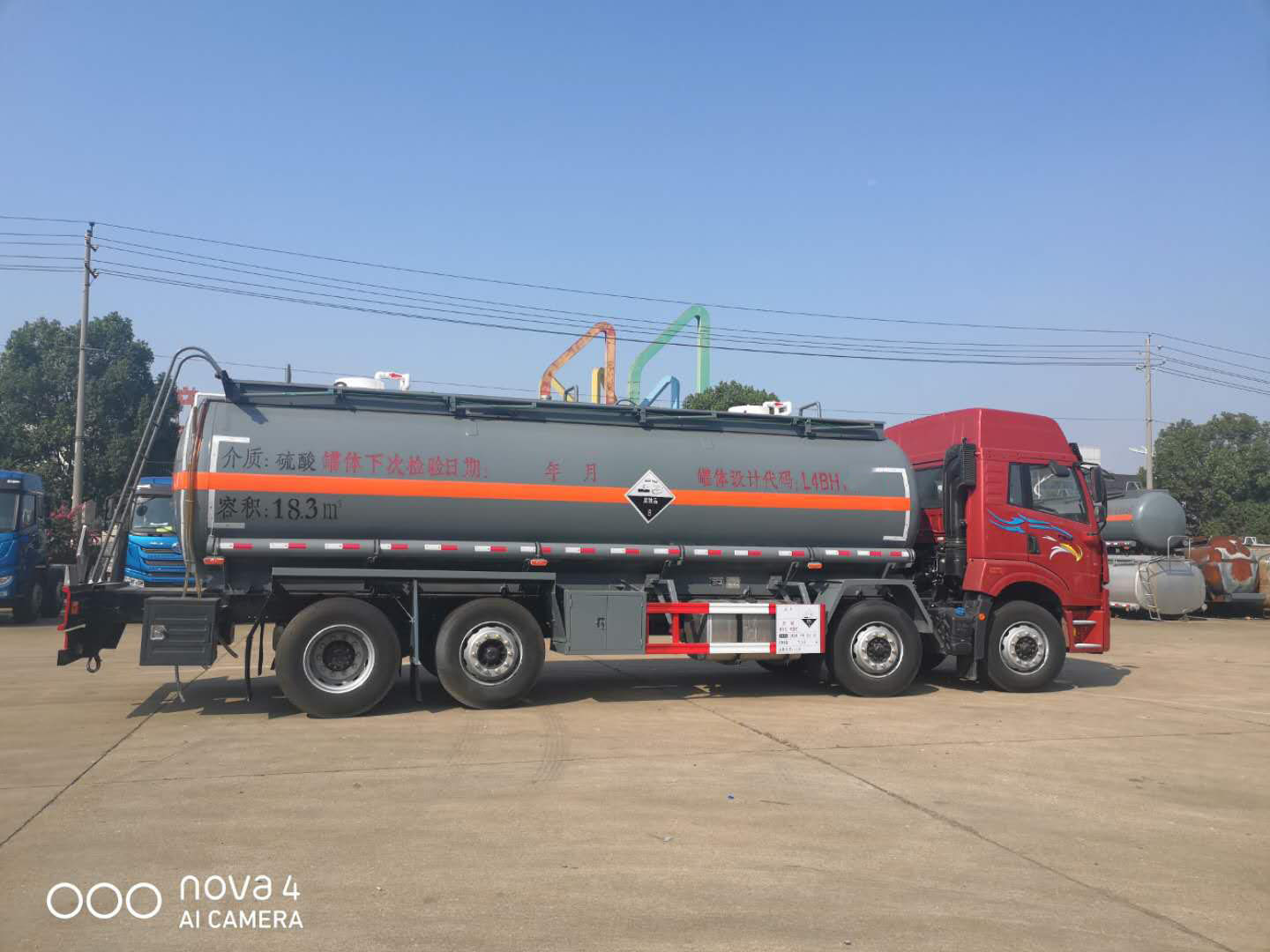 解放前四后六腐蝕品物品運輸車罐體采用碳鋼Q235制作,筒體厚度封頭厚度按GB18564設計,罐內聚乙烯滾塑16MM厚,罐頂單層圍板,圍板內做瀝青漆防腐,罐頂兩側配活動護欄,罐頂安裝2個全塑人孔蓋,2個通氣閥,罐頂預留1個安全閥法蘭。罐體底部底口位置加裝一個DN100不銹鋼襯氟海底閥帶緊急切斷裝置(按2019年新規加裝海底閥聲控裝置),采用4寸無縫管/出料管道內滾塑,出口3寸,在后尾左右自流各配一個DN80PP球閥帶快速接頭帶出口,罐體兩側為PVC炮筒式卸料管,配兩條和罐體一樣長的卸料鋼絲軟管2條,兩個4KG滅火器筒和2個4KG滅火器安裝于整車大梁左右,工具箱一個,按公告張貼反光帶、反光條、“腐蝕品”標識及“腐”字,油漆國標深灰色,整車左右以及后尾部各一塊安全告示牌,罐體后正部一個爬梯,擋泥板、左右防護、后保險杠、活動護欄,嚴格按公告圖片及尺寸制作。