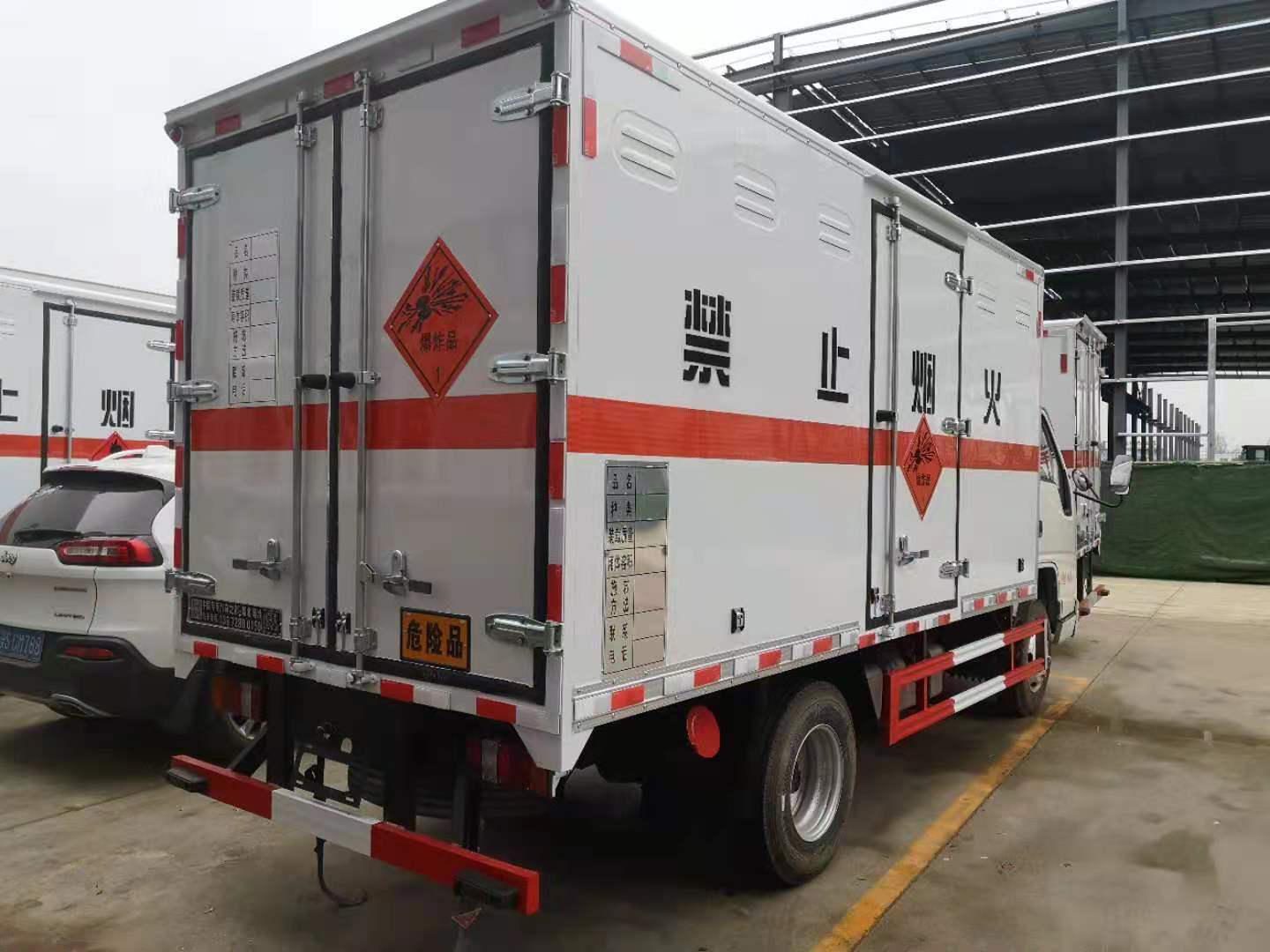 江鈴國六防爆車廂體嚴(yán)格按照公告尺寸制作,外板采用1mm厚冷軋板有一次性成型的百葉窗,內(nèi)飾為導(dǎo)電性能良好的鋁板有透氣孔,內(nèi)襯為矩形管骨架牢靠穩(wěn)定,內(nèi)部填充為透氣防潮阻燃的擠塑板,四種材料經(jīng)現(xiàn)代工藝復(fù)合而成,廂體外部上下鋁合金型材包邊,底板和車廂前下部鋪橡膠皮,后門雙開,右側(cè)中部單開門,內(nèi)部有固定貨物的臥環(huán),車輛外部有靜電帶、滅火器、防火罩,車廂內(nèi)安裝煙霧報警器和門防盜報警器,嚴(yán)格按照國家危險品相關(guān)法規(guī)張貼。