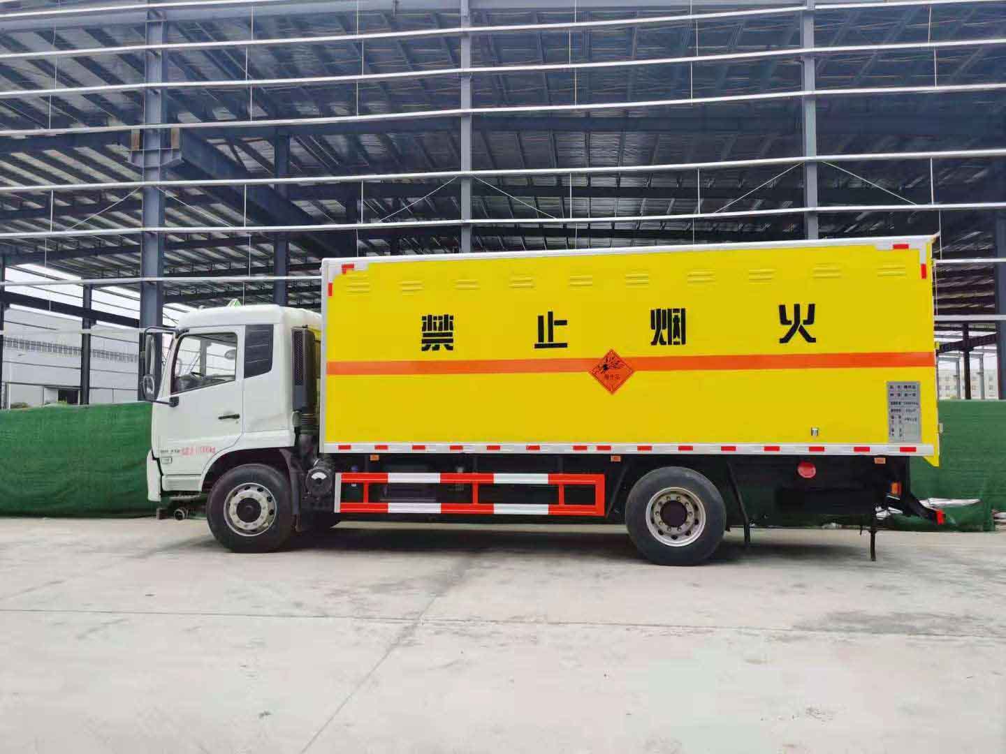 東風天錦一類危險品車采用東風天錦危險品車底盤,白色車頭,灰色車廂,帶中開側門,駕駛室帶倒車影像,駕駛室內安裝監視器。東風天錦4*2底盤,危險品專用底盤,D530排半標準頂,空調,康明斯B6.2NS6B210發動機,法士特8JS85E-C變速箱,軸距4700mm,4.5T/9T前后橋,板簧前3片后氣囊3/-,鋁160L油箱,速比4.88,275/80R22.5真空胎, 前盤式剎車,限速,ABS,EBS,FCWS/LDWS(前撞/車道偏離預警),TPMS(前軸單臺胎壓監測) 后雙開門,貨廂前、后各兩個示廓燈、貨廂內安裝離子感煙火災探測器、側廂及前廂內安裝固定臥環、地板裝置防靜電膠皮、側廂開通風口、安裝滅火器、安裝排氣火花熄滅器、車尾部安裝導靜電橡膠拖地帶、駕駛室安裝危險標志燈、門上安裝防盜報警器、車身側面及后部粘貼橙色反光標識、菱形標示、車體后部設置安全告示、后保險杠安裝緩沖加強橡膠塊。