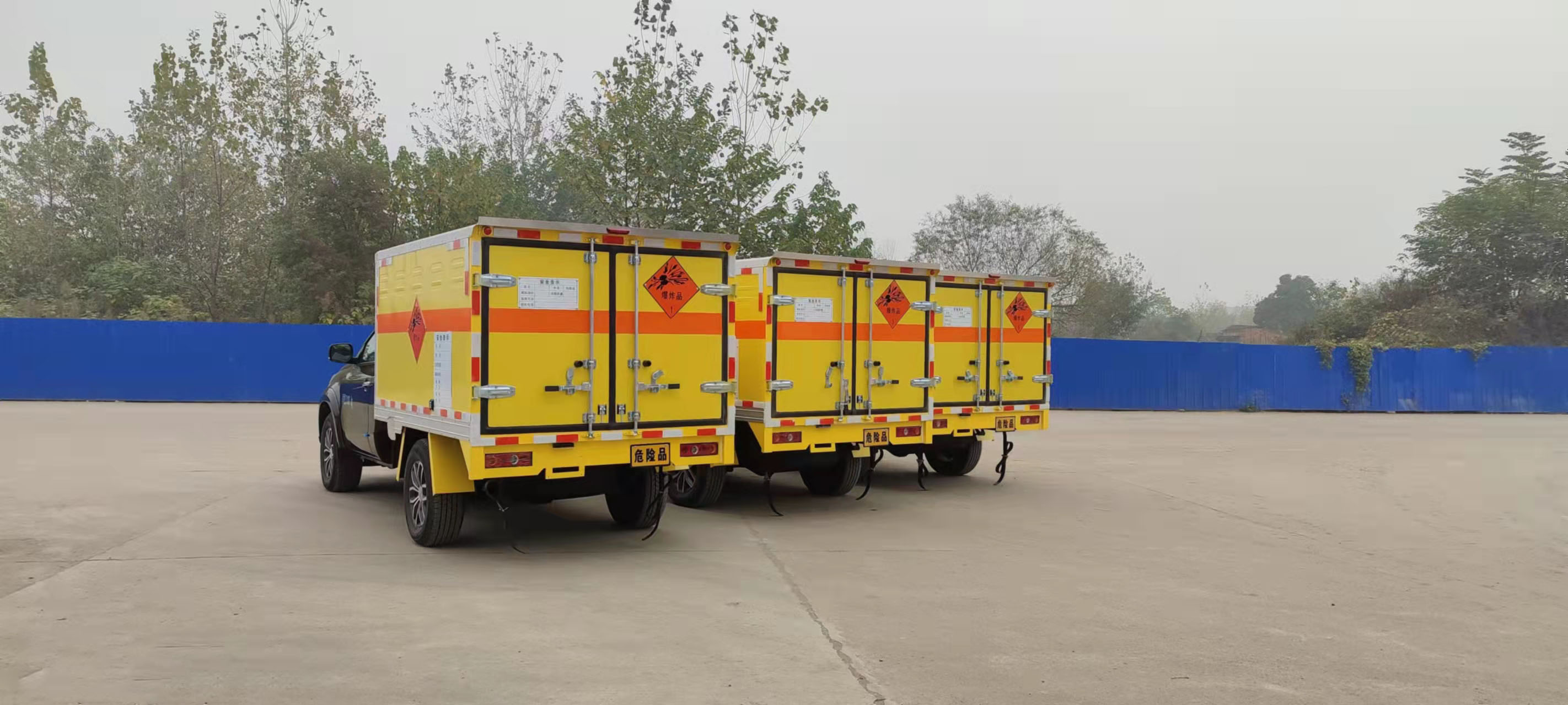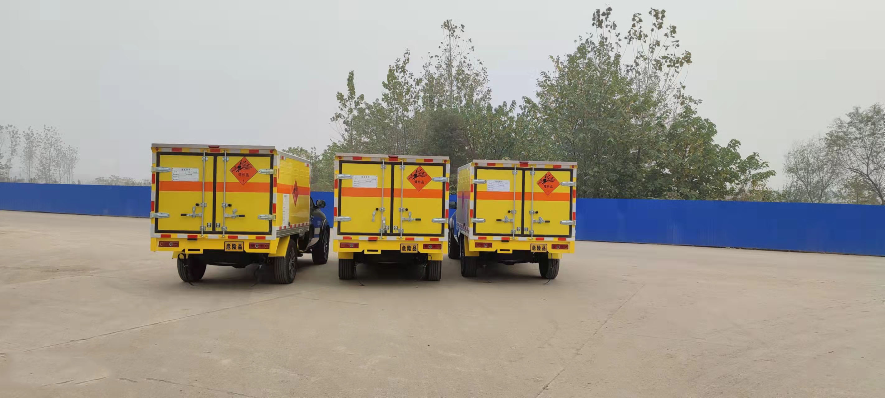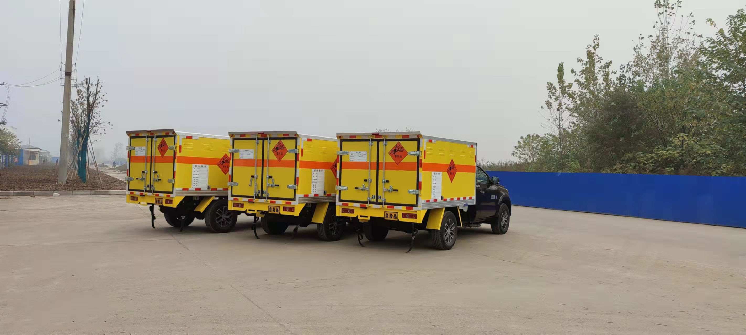 江鈴皮卡爆破器材運輸車雙面夾層結構,外板采用免漆板有一次性沖壓成型的百葉窗,內飾為導電性能良好的鋁板有透氣孔,復合加鉚合工藝,內襯為矩形管骨架牢靠穩定,骨架內部填充為透氣防潮阻燃材料。廂體外部四周鋁合金型材包邊,底板和車廂前下部鋪橡膠皮,后門雙開,右側單開側門,內部裝固定貨物的臥環,安裝煙霧報警器、防盜感應器。車身附件靜電接地帶、滅火器、防火罩、危險品三角燈、橙色反光帶、CCC反射器、菱形標志牌、危險品牌、安全告示齊全。