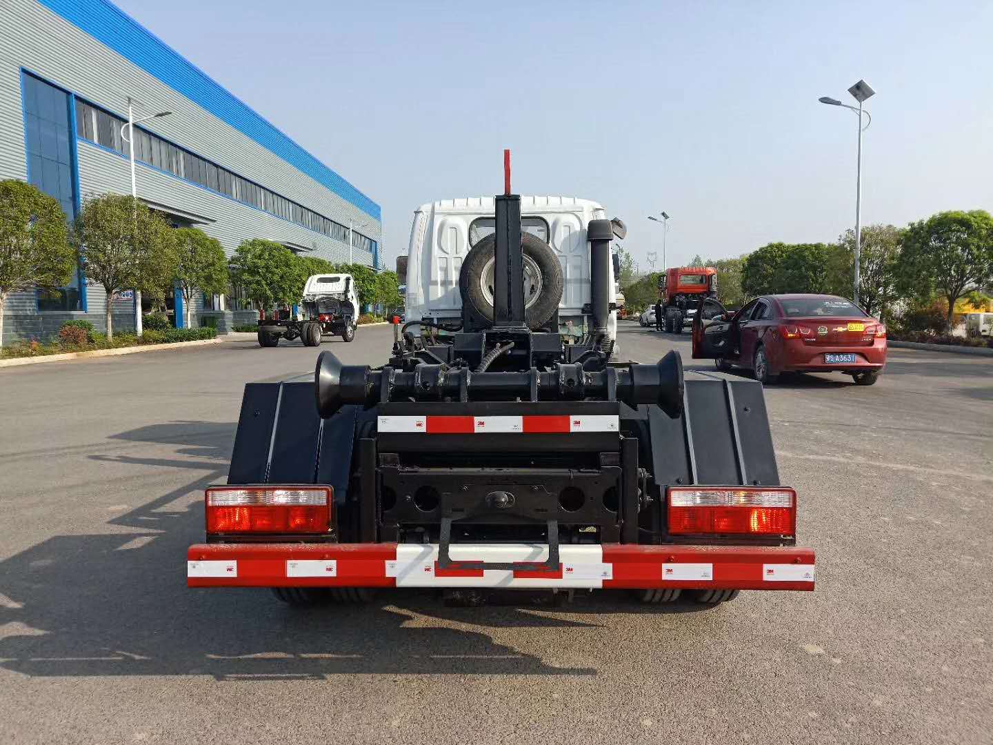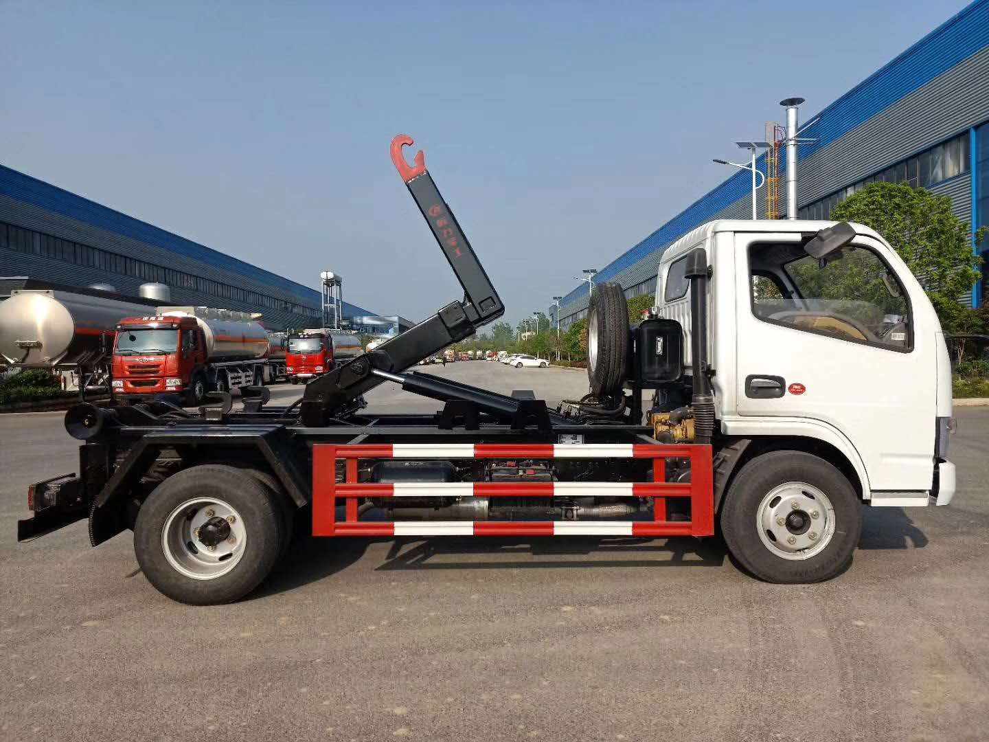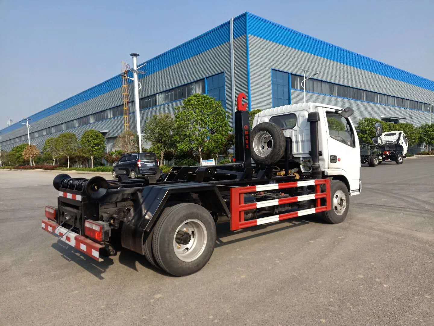 勾臂式垃圾車可將地下垃圾箱內的垃圾及垃圾箱一同拉至車上運走同時可自卸,且垃圾箱體采用液壓鎖緊或開啟,降 低了工人的勞動強度和改善了工作環境。該垃圾車的收運方式是目前世界上廣泛采用的垃圾收運方式,可以實現一車多箱,大大降低了配備成本和空間等等;其專用裝置的功能均以汽車發動機為動力,通過液壓機構手動或電控、氣控來實現。