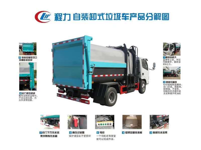 上裝配置:弧形箱體容積7.5立方;采用Q345高強(qiáng)度錳鋼4mm;長(zhǎng)源油泵;江蘇多路閥;國(guó)產(chǎn)液壓油缸,推鏟卸料。液壓后蓋,后蓋帶密封條;后門液壓鎖緊。鏈條式提升機(jī);可掛240L標(biāo)準(zhǔn)塑料垃圾桶;駕駛室內(nèi)集中電控(提升機(jī)外部手動(dòng)控制);后門鎖緊與后蓋開關(guān)的操作具有防誤操作,車身高位示廓燈/邊燈/作業(yè)照明燈。