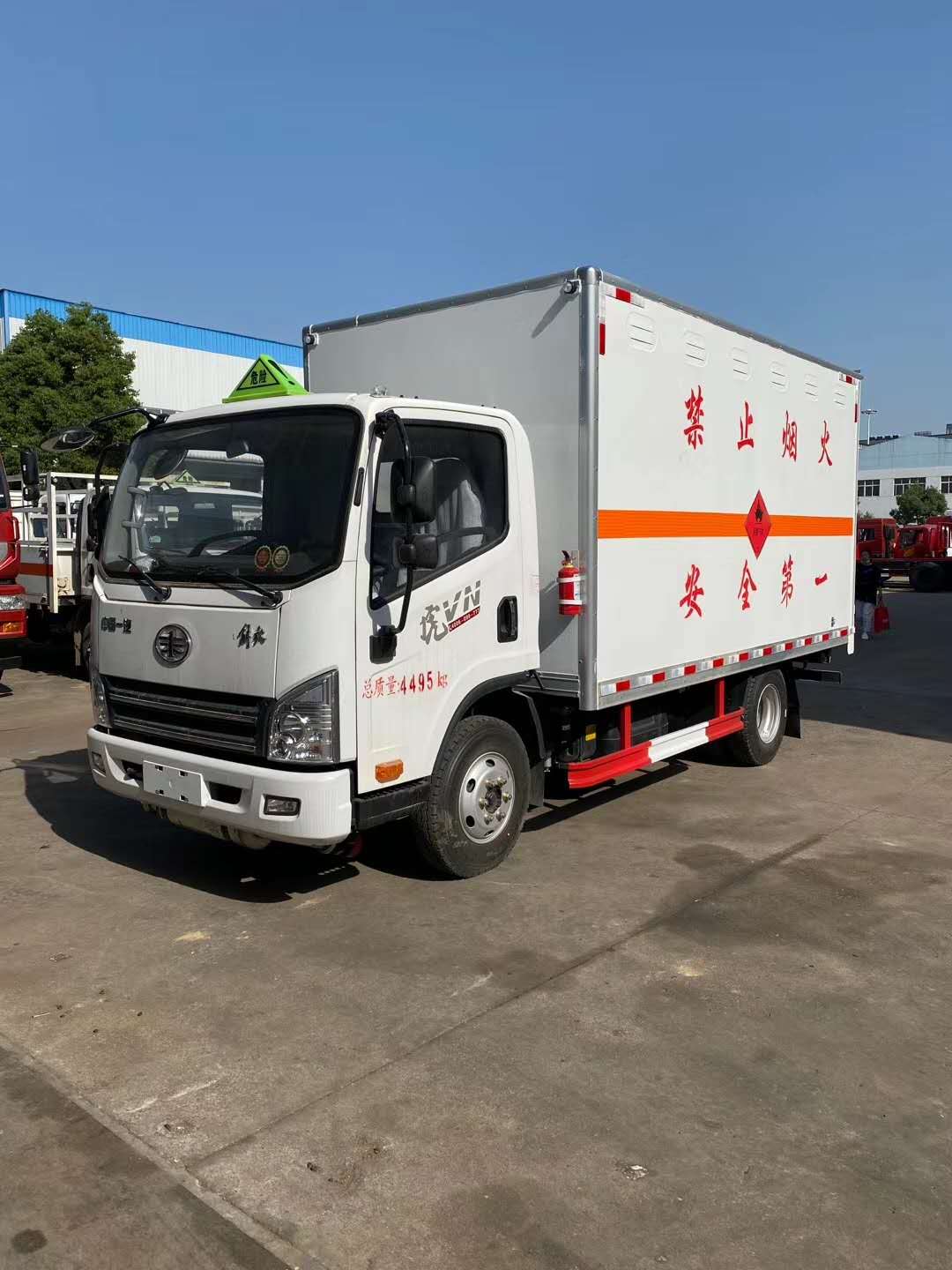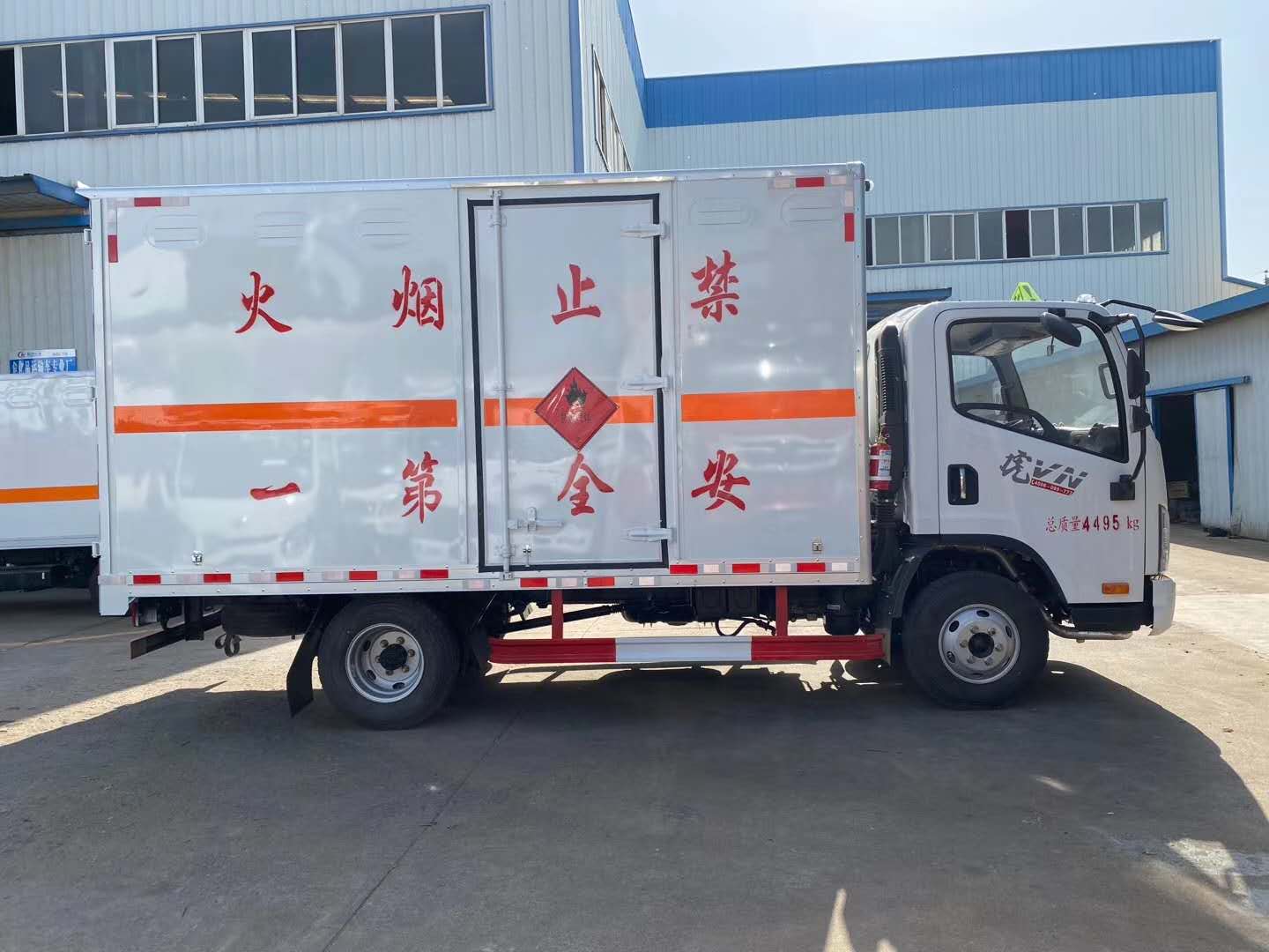 貨廂尺寸:4150mm×1910mm(可選2100mm)×1800mm(可選2100mm),貨廂外板為瓦楞板材質,中間為方鋼支撐,廂體兩側中部配有捆綁固定貨物的臥環,底板鋪防靜電膠板,廂體頂部安裝煙霧報警器,尾門有防盜報警功能。駕駛室配備三角警示燈,整車反光標,廂體粘貼危險品標識,尾部粘貼危險品告示,隨車配備滅火器、反光背心、停車木。