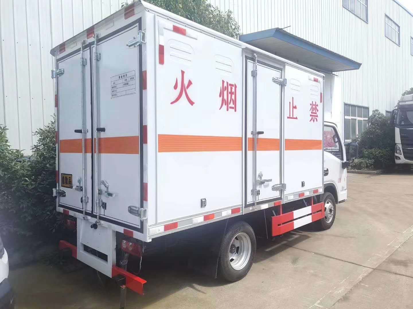 躍進S80國六雜項危險品車廂體材質為外飾冷軋鋼板、內飾鋁合金板、中間填充隔熱阻燃材料,選裝側門和隔倉,廂體兩側上方設有防雨功能自然通風窗口,底部鋪有阻燃導靜電膠板,廂體側面裝有固定拉環,與捆綁帶使用捆綁貨物以避免移動。在車廂內頂部安裝感煙報警器,在門器框上方安裝有防盜報警器,廂體外側安裝示廓燈及滅火器支架,配置兩個滅火器,并有“嚴禁煙火”和“爆”等字樣,廂體周邊貼反光標識。后門貼有安全告示,危險品標牌。車輛尾部副梁安裝兩條拖地導靜電帶,駕駛室頂部裝有安全三角燈。廂體顏色可定制:黃、白、灰色等。