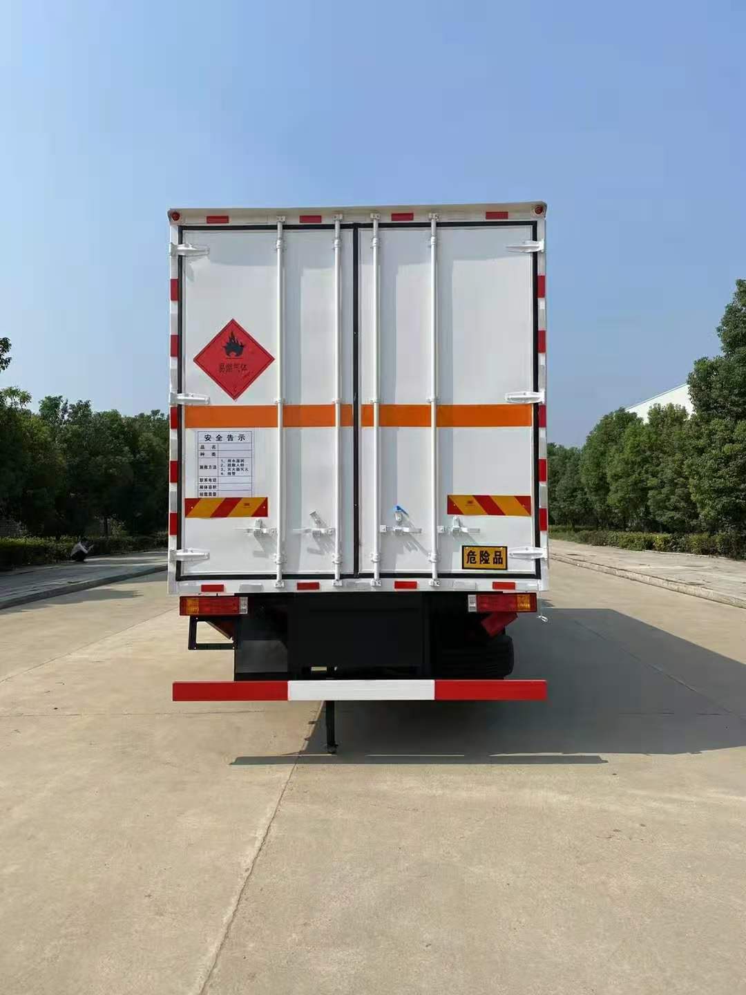 陜汽三軸國六雜項危險品車廂體采用外板采用1mm厚冷軋板有一次性成型的百葉窗,內飾為導電性能良好的鋁板有透氣孔,內襯為矩形管骨架牢靠穩定,內部填充為透氣防潮阻燃的擠塑板,廂體外部上下鋁合金型材包邊,底板和車廂前下部鋪橡膠皮,后門雙開,內部有固定貨物的臥環,車輛外部有靜電帶、滅火器、防火罩,車廂內安裝煙霧報警器和防盜報警器,嚴格按照國家危險品相關法規張貼“易燃液體”反光標。