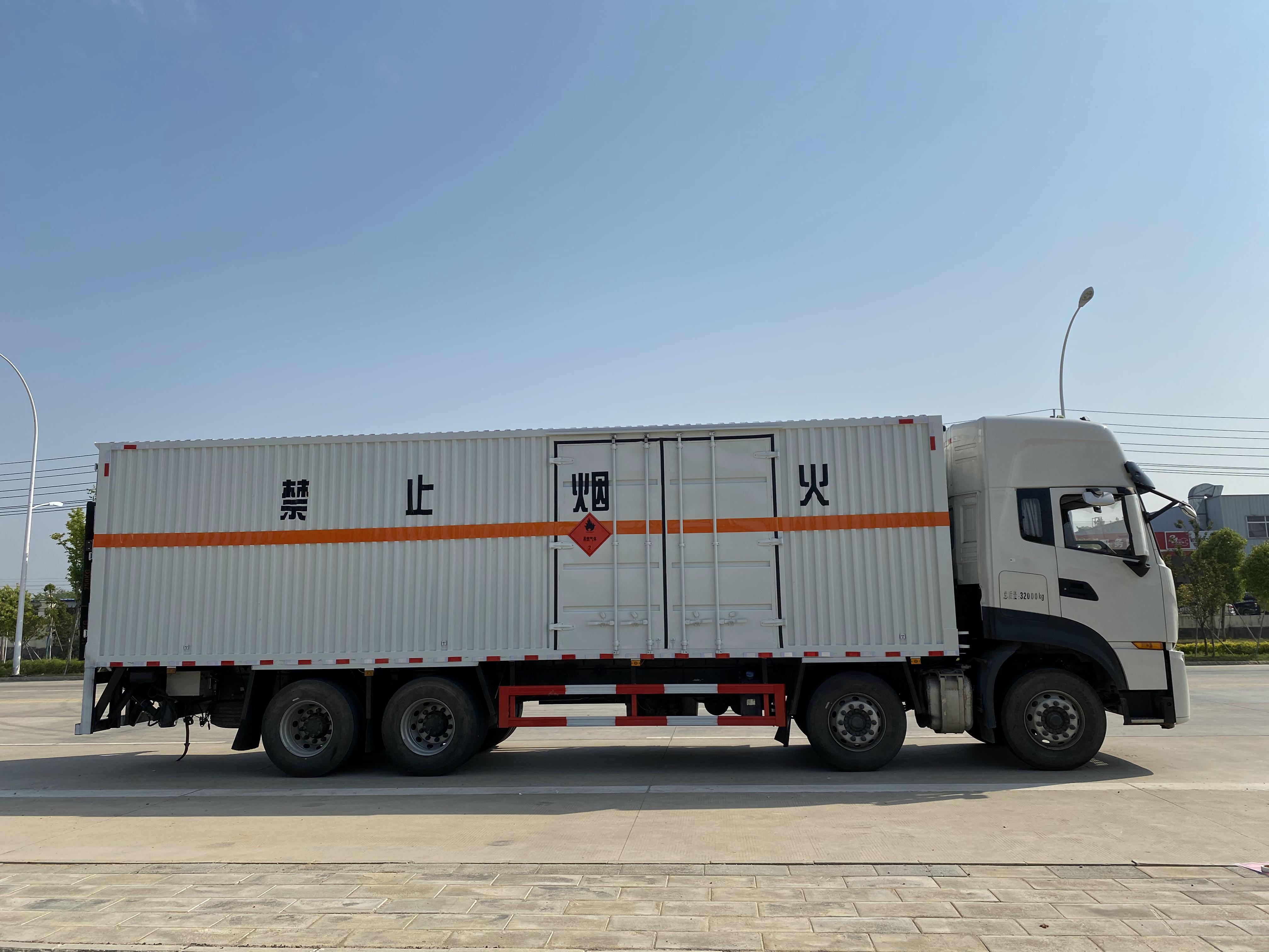 東風天龍前四后八危險品車外板采用冷軋鋼板壓瓦成型,內(nèi)部槽鋼骨架,底板采用4mm花紋板上鋪設(shè)防靜電膠皮。廂體右側(cè)開對開門,后部設(shè)置對開門。廂體內(nèi)部安裝煙霧報警器及防盜報警感應(yīng)器。箱體及駕駛室為白色。廂內(nèi)四周內(nèi)飾采用鋁合金角鋁型材壓邊。廂內(nèi)安裝固定運載物的臥環(huán),防燃煙霧報警器,門上安裝防盜報警器,前置安裝防撞防靜電膠皮。廂體門框采用三元乙丙一次成形像膠密封條。廂體右側(cè)開兩個對開門,后部設(shè)置對開門。廂體內(nèi)部安裝煙霧報警器及防盜報警感應(yīng)器。箱體及駕駛室為白色。帶2噸液壓尾板。