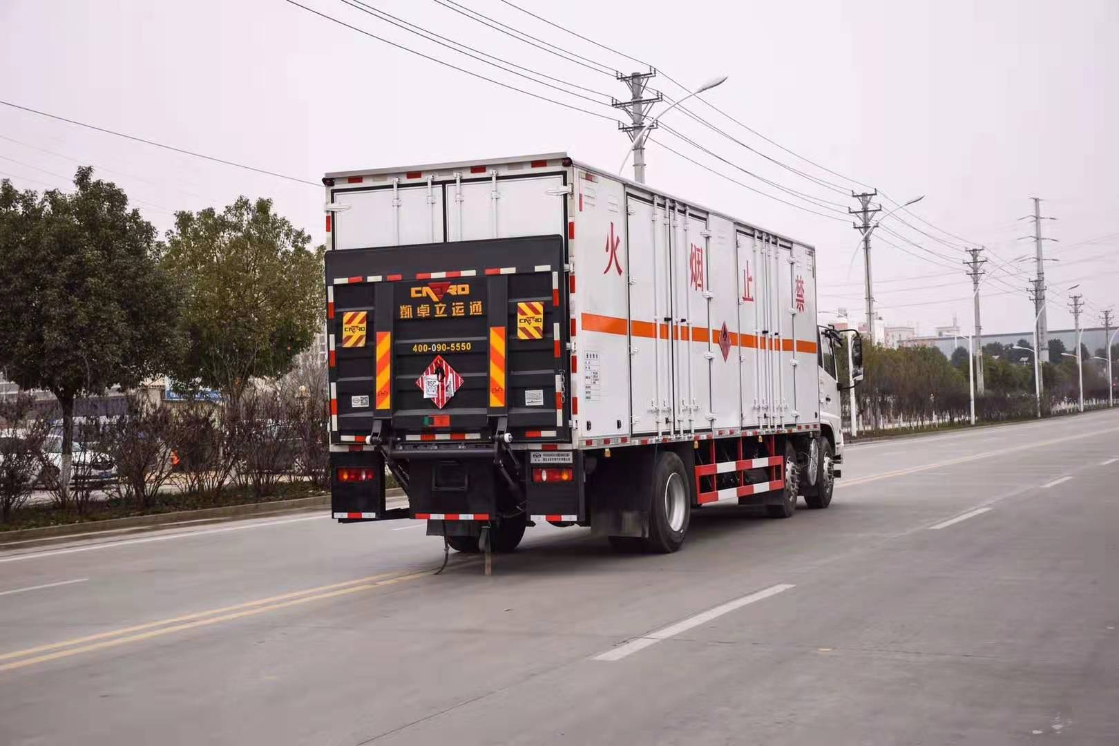 東風天錦7米7國六危險品車廂體采用外飾冷軋鋼板,內飾鋁合金板,中間填充隔熱阻燃材料,(選裝側門和隔倉)廂體兩側上方設有防雨功能自然通風窗口,底部鋪有阻燃導靜電膠板,廂體側面裝有固定拉環,與捆綁帶使用捆綁貨物以避免移動。在車廂內頂部安裝感煙報警器,在門器框上方安裝有防盜報警器,廂體外側安裝示廓燈及滅火器支架,配置兩個滅火器,并有“嚴禁煙火”和“爆”等字樣,廂體周邊貼反光標識。后門貼有安全告示,危險品標牌。車輛尾部安裝兩條拖地導靜電膠帶,駕駛室頂部裝有安全三角燈。廂體顏色有:黃、白、灰色等可選。
