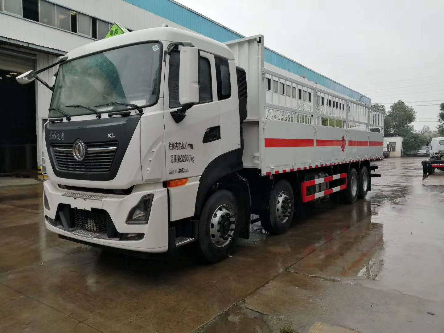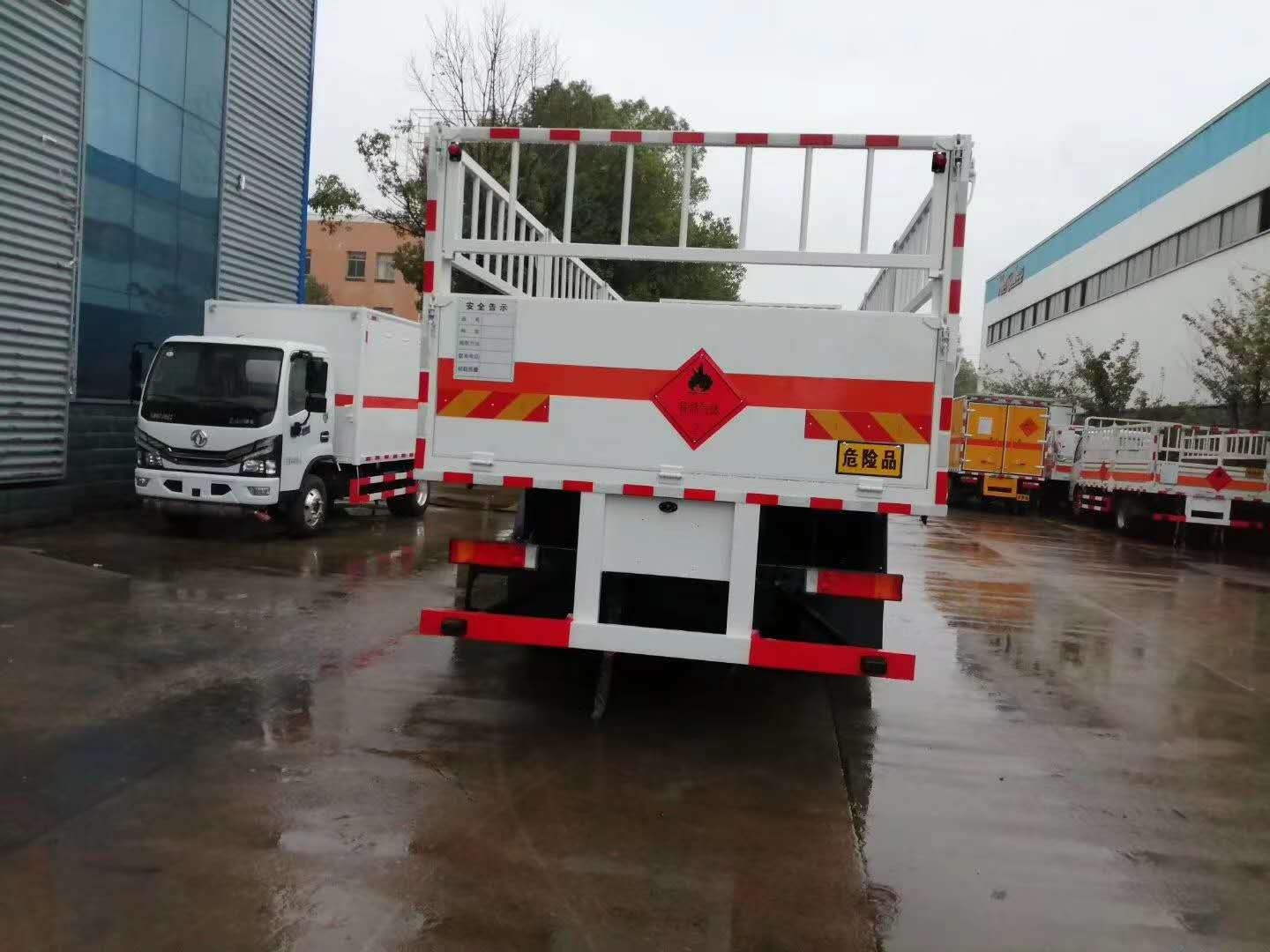 東風天龍9米4國六氣瓶運輸車廂體嚴格按照公告尺寸制作,箱體采用廂式欄板車結構,外厚度為1.1毫米厚度武鋼冷軋鋼板(或沖壓成瓦楞板,以公告為準),內加強“幾”字型加強梁,車體底板加強處理并做防靜電處理。車體的左側、右側,和后欄板栓鉤結構,可向下打開,方便上下貨物,車體為空曠式車型,大大減少了運輸物品因為狹窄空和強烈碰撞產生氣瓶爆炸的危險性,箱體外觀涂裝白色油漆,在欄板的中間位置粘貼橙色的危化車標帶,并在車體的左、右、后部粘貼“易燃氣體”或“不燃氣體”標識。駕駛室內部配備兩只滅火器,后保險杠處安裝防追尾事故的緩沖固定塊。此款車輛屬于國家規定的危險品二類倉欄式運輸車。廂體內部有固定貨物的臥環,車輛外部有靜電帶、滅火器、防火罩,車廂內安裝煙霧報警器和門防盜報警器,嚴格按照國家危險品相關法規張貼。
