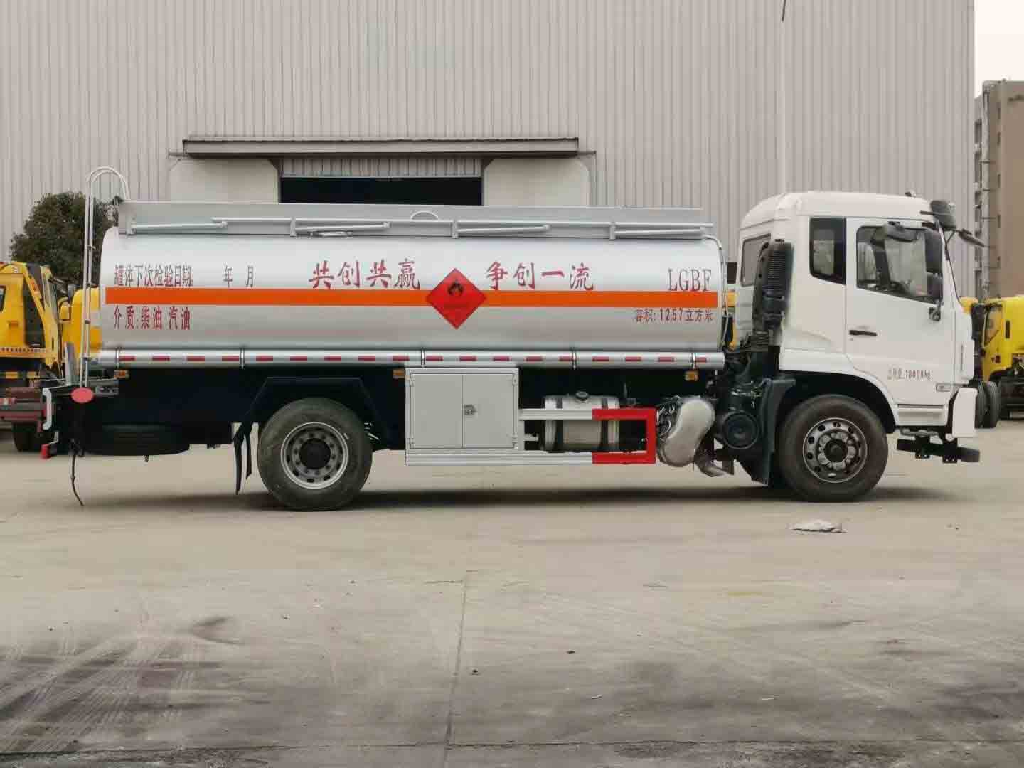 國六東風錦程K5全法規加油車標配前下防護,排氣管前置,限速80kw/h,四通道ABS,安全帶未系提醒裝置,制動襯片磨損提醒裝置,前輪防爆胎應急安全裝置。標配符合JT/T 1285-2020標準的新法規項:前向碰撞預警,車道偏離預警,EBS電控制動系統,胎壓監測系統。罐體公告容積12.57立方米;單倉帶泵,罐體采用Q235碳鋼板制作,厚度5(mm),內置防浪板,前后水壓封頭;全套歐標包含:罐體頂部2個鋁合金歐標罐口,底部1個氣動緊急切斷閥;1套歐標下裝油及油氣回收系統,1套防溢流系統;安裝氣動緊急切斷閥;頂部上圍板內置式上走道帶防滑網,兩側安裝活動護欄,尾部安裝爬梯一個;泵進泵出口及下裝油口安裝在車身一側閥門箱內,兩根鐵制管道筒配透明輸油膠管2根;安全告示牌一個,安裝靜電拖地帶,靜電接地線,配備滅火器2支;罐體銀灰色油漆,中部粘貼橙色反光帶,粘貼“易燃液體”標識及紅白反光條,安裝LED示廓燈;選裝車載加油機。