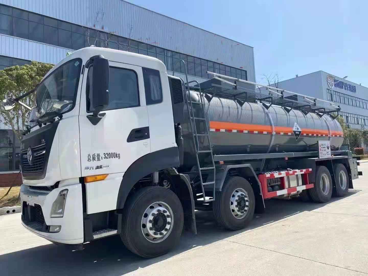 東風天龍腐蝕品罐式運輸車底盤采用東風天龍DFH1320D2(國六前四后八危化底盤);白色高頂雙臥駕駛室,DDi75E350-60發動機;九檔變速箱型號9JS135TA,檔位速比(高/低)11.02/0.73,5.5噸前橋,10噸后橋,295/80R22.5 18PR輪胎,前橋為盤式車軸,后橋為氣囊式,氣囊主座椅,350L鋁合金油箱。EBS,胎壓監測,車道偏離及前碰撞預警。罐體及整車尺寸嚴格按公告制作,整車型號:HLW5320GFWD6,公告容積:18.9立方,外罐體材料為Q235B型碳鋼板材,筒體4mm,封頭5mm,罐體通倉,蝶形封頭,內襯聚乙稀塑厚度16mm,兩道鋼塑式防浪板,兩個全塑罐口帶接酸盤,罐體底部帶一套DN100型不銹鋼襯四氟緊急切斷閥(帶聲光報警裝置),副梁前高后低,4寸襯塑管道,尾部大梁下左右邊各一個DN80型襯氟球閥出口為出料口并帶保護箱。罐體頂部帶上圍板,圍板內做重瀝青防腐,帶不銹鋼升降護欄,尾部爬梯,兩根卸料管帶PVC炮筒管,兩個8KG滅火器,一個工具箱,其余按廠家標配生產制作。