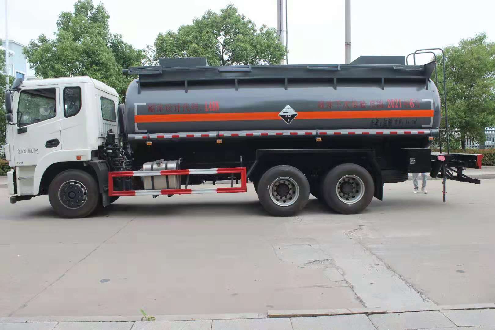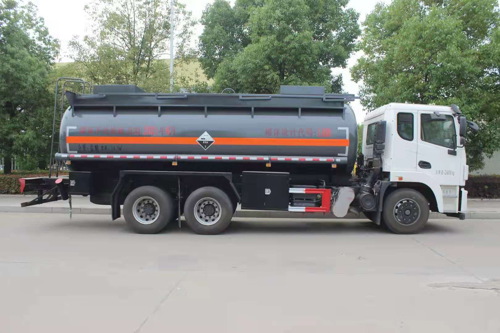 東風錦程后八輪腐蝕品罐式運輸車整車型號SCS5260GFWEQ6型腐蝕性物品罐式運輸車,采用東風錦程后八輪EQ1260GSZ6DJ型底盤,齊星大底板半浮駕駛室,新款V6面罩,多功能方向盤,電動玻璃,中控門鎖,陜齒9檔變速箱,軸距4600+1350mm,玉柴YCS06270-60發(fā)動機,國六排放。罐體容積14.7立方,介質(zhì):鹽酸、硫酸、次氯酸鈉、雙氧水,罐內(nèi)襯16-18mm聚乙稀,罐頂貳個鋼襯塑進料口,罐體底部一個DN100不銹鋼襯四氟海底閥,罐體后左右各一個DN80的襯塑球閥,帶襯塑出料口及堵蓋,罐頂防腐處理。