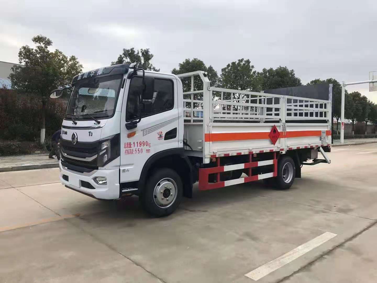 東風華神T3氣瓶車采用廂式欄板車結構,外厚度為1.1毫米厚度武鋼冷軋鋼板(或沖壓成瓦楞板,以公告為準),內加強“幾”字型加強梁,車體底板加強處理并做防靜電處理。車體的左側、右側,和后欄板栓鉤結構,可向下打開,方便上下貨物,車體為空曠式車型,大大減少了運輸物品因為狹窄空和強烈碰撞產生氣瓶爆炸的危險性,箱體外觀涂裝白色油漆,在欄板的中間位置粘貼橙色的危化車標帶,并在車體的左、右、后部粘貼“易燃氣體”或“不燃氣體”標識。駕駛室內部配備兩只滅火器,后杠處安裝防追尾事故的緩沖固定塊。此款車輛屬于國家規定的危險品二類危險品運輸車。