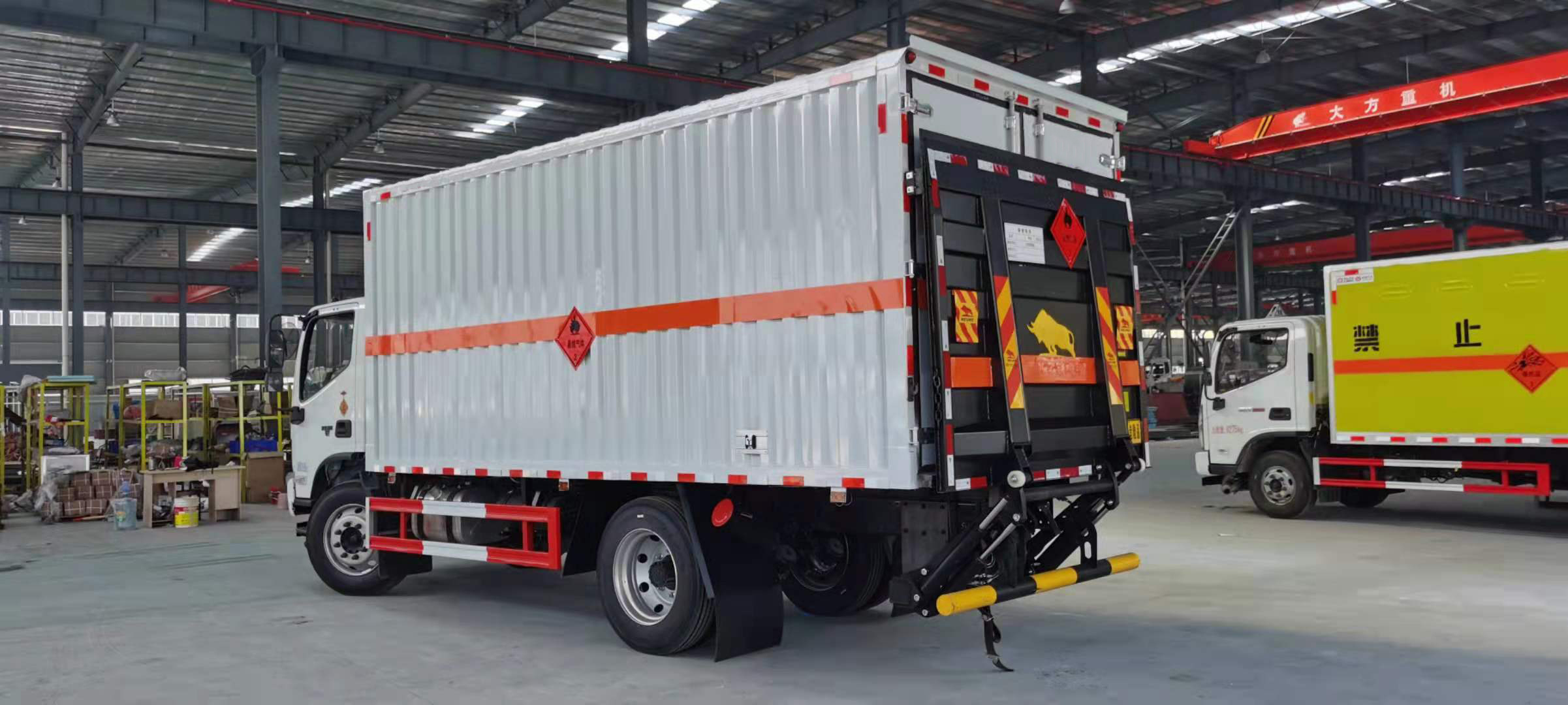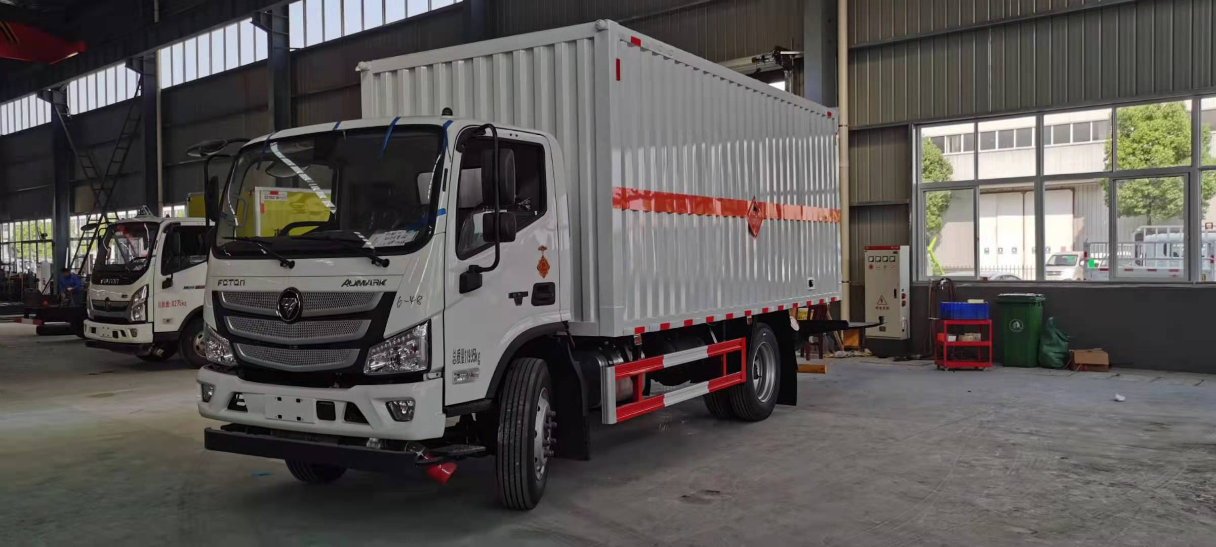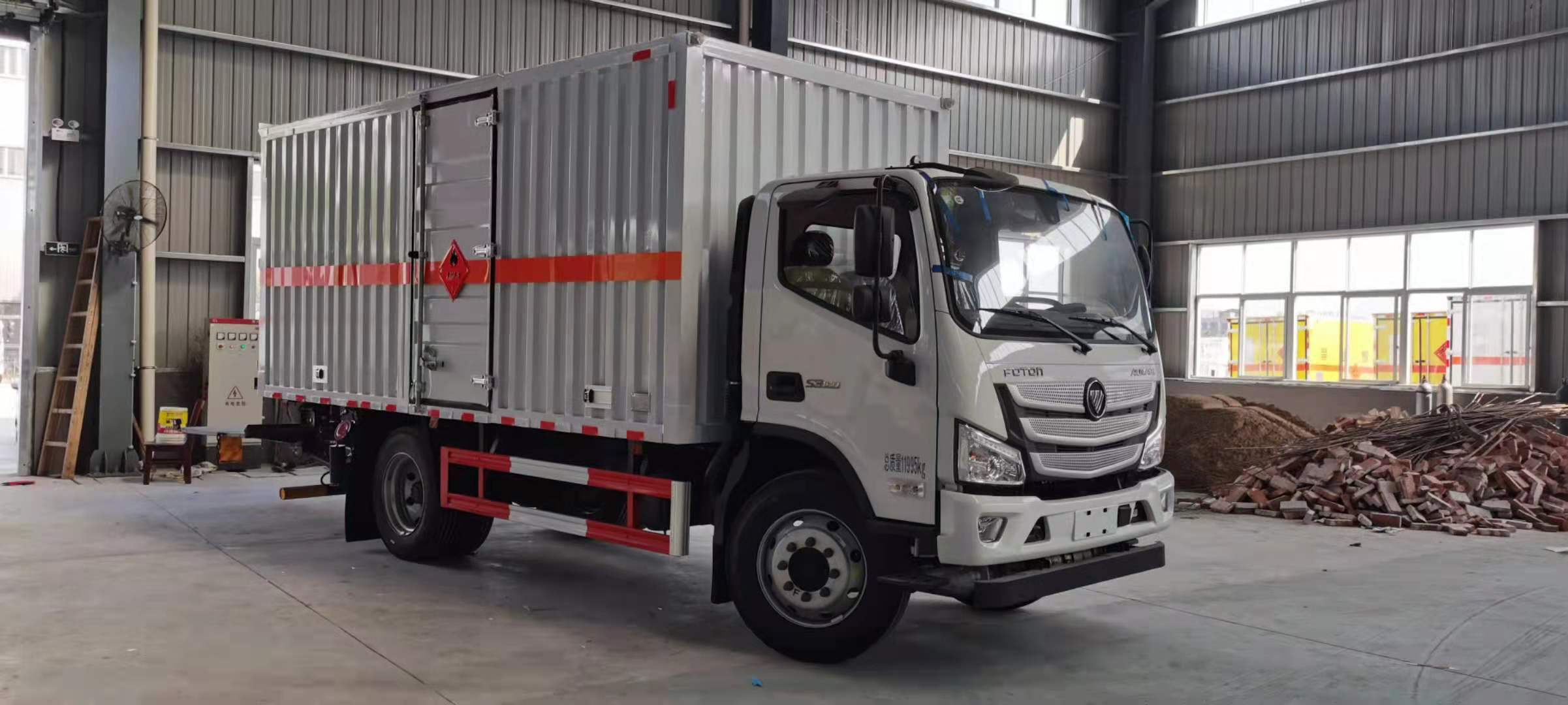 福田歐馬可3.8排量156馬力國六5米1危險品車沖壓成瓦楞板,以公告為準),內加強“幾”字型加強梁,車體底板加強處理并做防靜電處理。車體的左側、右側,和后欄板栓鉤結構,可向下打開,方便上下貨物,車體為空曠式車型,大大減少了運輸物品因為狹窄空和強烈碰撞產生氣瓶爆炸的危險性,箱體外觀涂裝白色油漆,在欄板的中間位置粘貼橙色的危化車標帶,并在車體的左、右、后部粘貼“易燃氣體”或“不燃氣體”標識。駕駛室內部配備兩只滅火器,后杠處安裝防追尾事故的緩沖固定塊。此款車輛屬于國家規定的危險品二類危險品運輸車。
