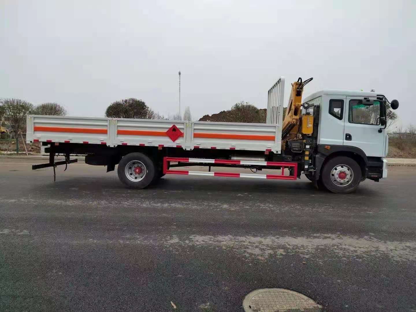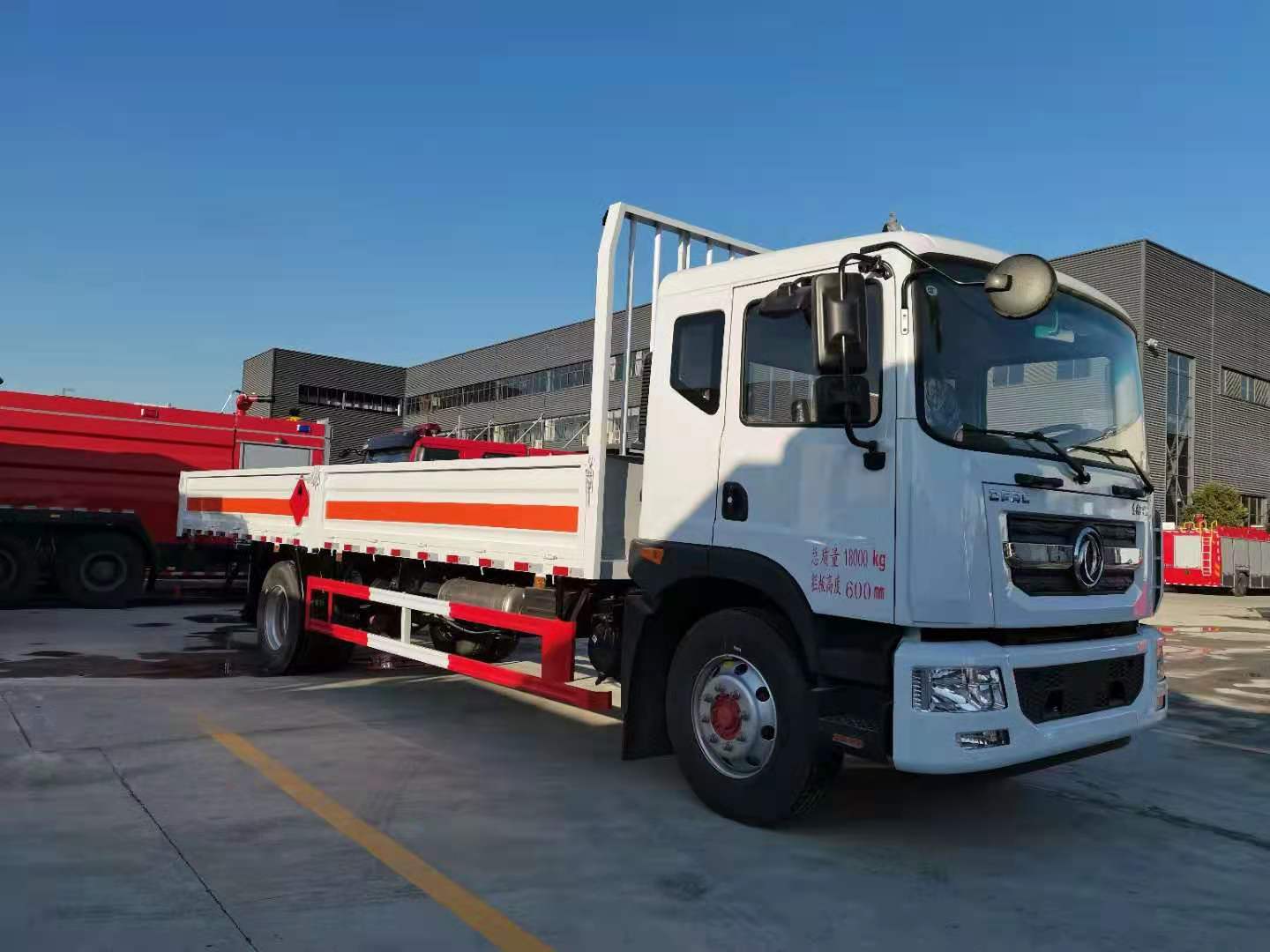 東風D9國六6米8氣瓶運輸車(低平板)采用廂式欄板車結構,外厚度為1.1毫米厚度武鋼冷軋鋼板(或沖壓成瓦楞板,以公告為準),內加強“幾”字型加強梁,車體底板加強處理并做防靜電處理。車體的左側、右側,和后欄板栓鉤結構,可向下打開,方便上下貨物,車體為空曠式車型,大大減少了運輸物品因為狹窄空和強烈碰撞產生氣瓶爆炸的危險性,箱體外觀涂裝白色油漆,在欄板的中間位置粘貼橙色的危化車標帶,并在車體的左、右、后部粘貼“易燃氣體”或“不燃氣體”標識。駕駛室內部配備兩只滅火器,后杠處安裝防追尾事故的緩沖固定塊。此款車輛屬于國家規定的危險品二類危險品運輸車。