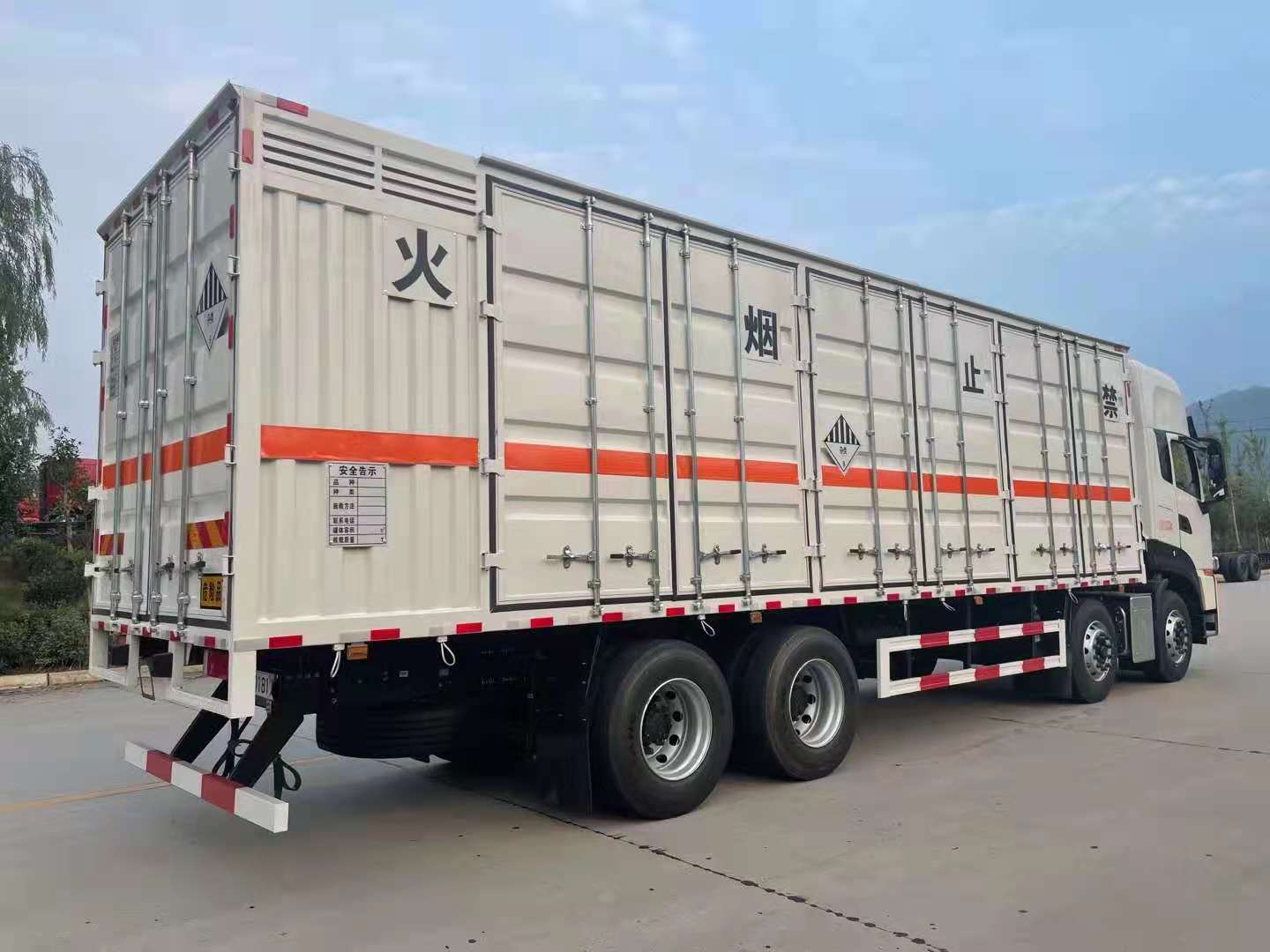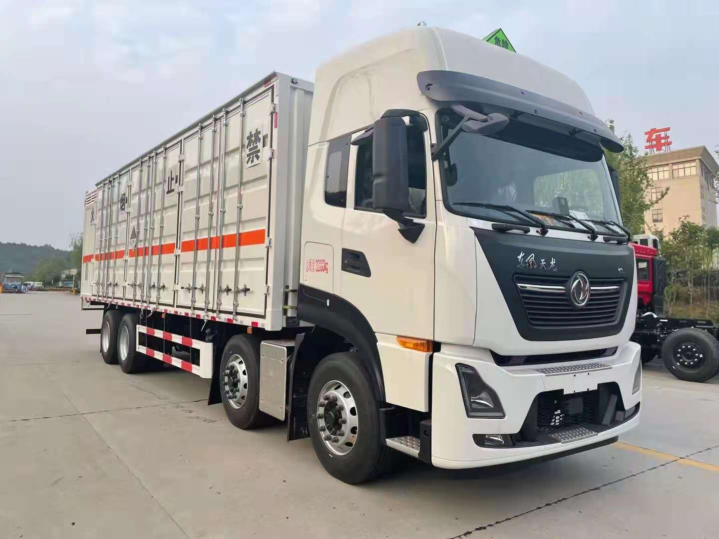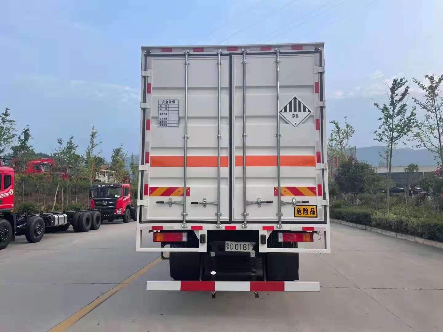 東風天龍前四后八九類雜項危險品廂式車采用東風天龍危險品車專用底盤,采用天龍D320高頂雙臥駕駛室,DDI 350馬力六缸發動機,陜齒9擋變速箱,鋁合金350L油箱,帶空調,電動玻璃,遙控鑰匙,行車記錄儀,氣囊座椅,危險品底盤法規標配,底盤采用前盤后鼓制動方式。帶發動機制動+排氣制動,EBS,防碰撞預警,胎壓監測,盲區監測。