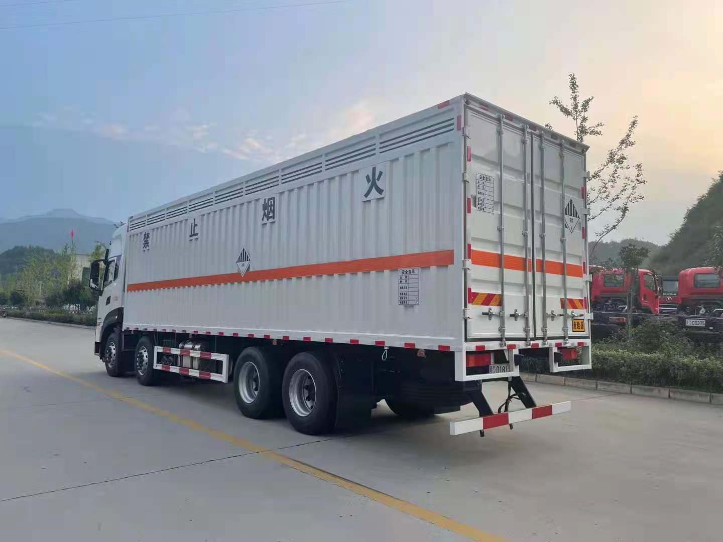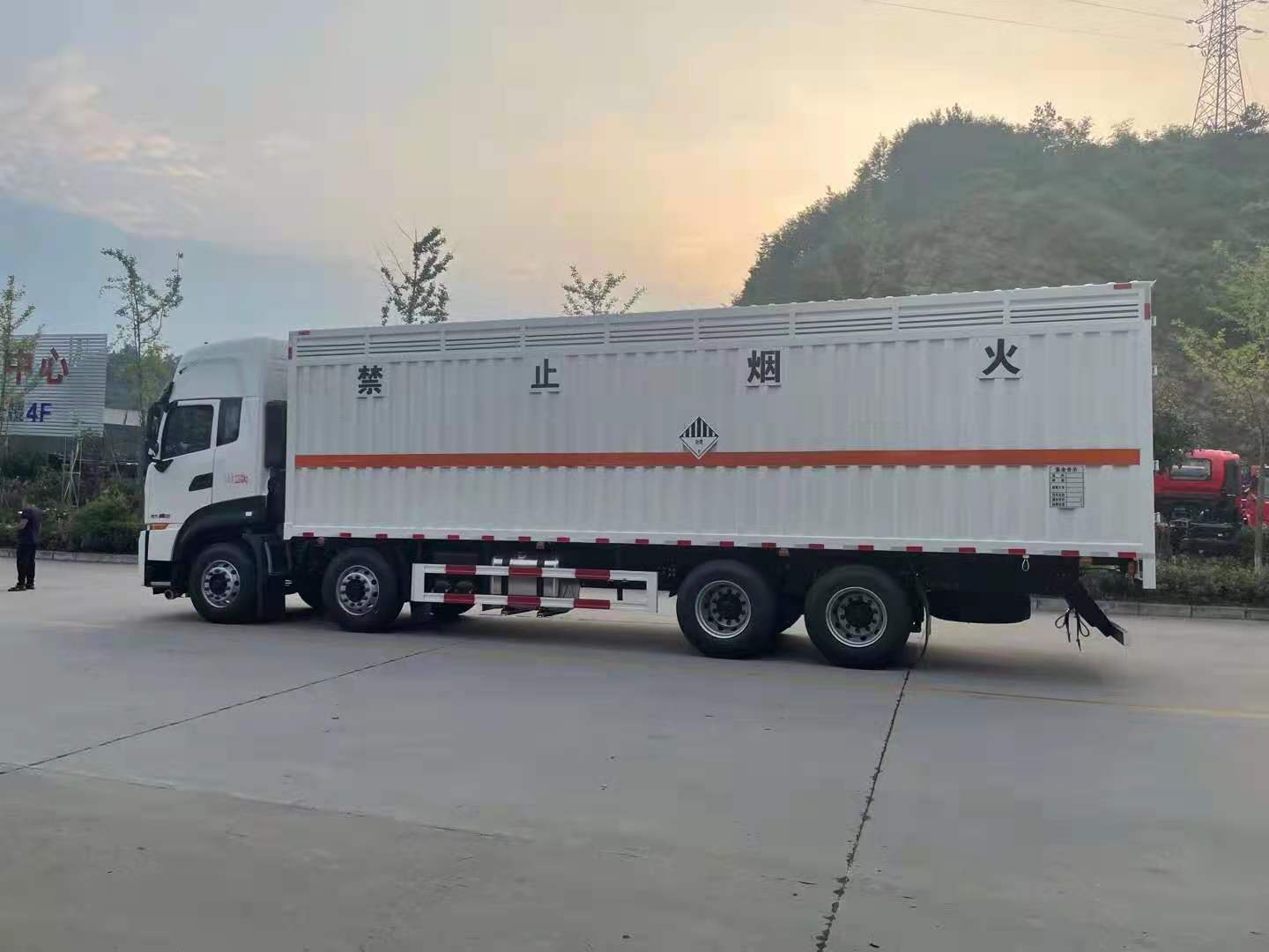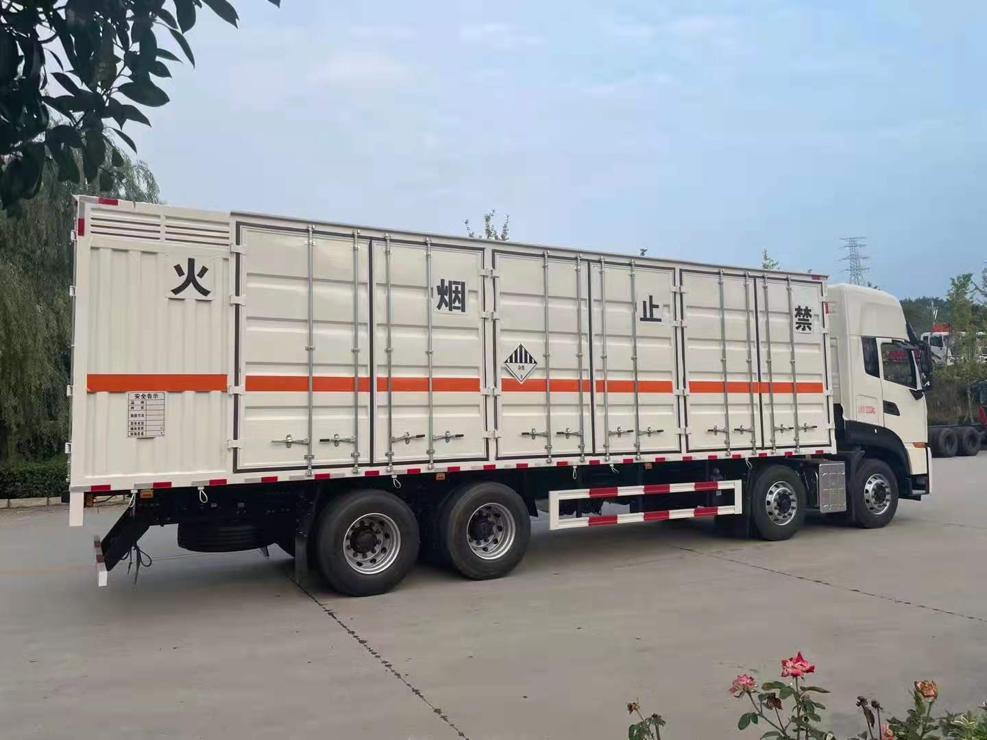 東風天龍前四后八九類雜項危險品廂式車采用東風天龍危險品車專用底盤,采用天龍D320高頂雙臥駕駛室,DDI 350馬力六缸發動機,陜齒9擋變速箱,鋁合金350L油箱,帶空調,電動玻璃,遙控鑰匙,行車記錄儀,氣囊座椅,危險品底盤法規標配,底盤采用前盤后鼓制動方式。帶發動機制動+排氣制動,EBS,防碰撞預警,胎壓監測,盲區監測。
