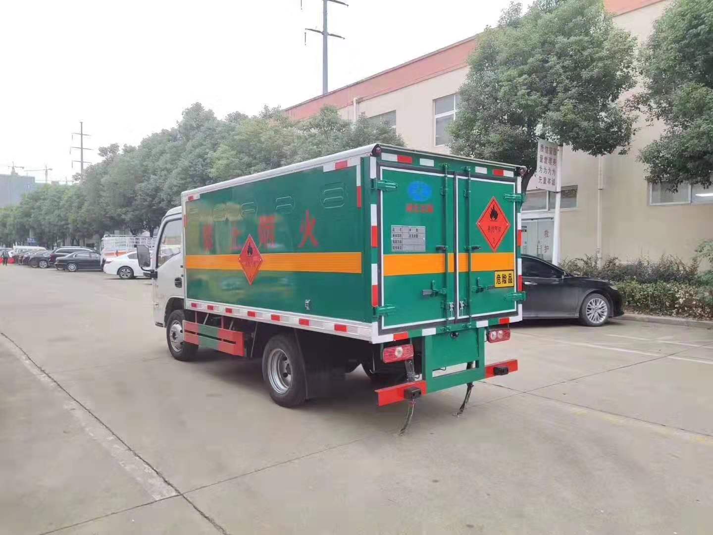 躍進可進地下車庫危險品車廂體材質為外飾冷軋鋼板、內飾鋁合金板、中間填充隔熱阻燃材料,選裝側門和隔倉,廂體兩側上方設有防雨功能自然通風窗口,底部鋪有阻燃導靜電膠板,廂體側面裝有固定拉環,與捆綁帶使用捆綁貨物以避免移動。在車廂內頂部安裝感煙報警器,在門器框上方安裝有防盜報警器,廂體外側安裝示廓燈及滅火器支架,配置兩個滅火器,并有“嚴禁煙火”和“爆”等字樣,廂體周邊貼反光標識。后門貼有安全告示,危險品標牌。車輛尾部副梁安裝兩條拖地導靜電帶,駕駛室頂部裝有安全三角燈。廂體顏色可定制:黃、白、灰色等。