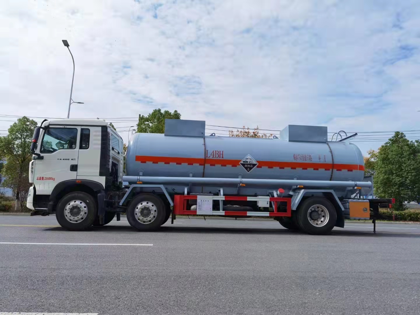 重汽豪沃6x2腐蝕性物品罐式運輸車公告已下發,公告容積14.5立方,有效容積13.86立方,襯塑厚度16-20mm,適用介質:硫酸、鹽酸、液堿、硝酸、次氯酸鈉,腐蝕性物品罐式運輸車:罐體及整車尺寸嚴格按公告制作,整車型號:HLW5180GFWEQ6,公告容積:9.69立方,外罐筒體材料4mm;罐體通倉,罐體內襯聚乙稀塑厚度16mm,一道鋼襯塑雙層防浪板,頂部一個全塑罐口帶接酸盤,罐口周圍帶方盒子式上圍板,圍板內做重瀝青防腐,罐體尾下部帶一個DN100型不銹鋼襯四氟海底閥(帶聲光報警裝置),副梁前高后低,罐體尾部左右各一個自流口,用DN80襯氟球閥控制,帶全塑保護箱,大梁下出料。罐體頂部右側帶護欄,走道,尾部爬梯,兩個滅火器,兩根卸料管,一個工具箱,其余按廠家標配。