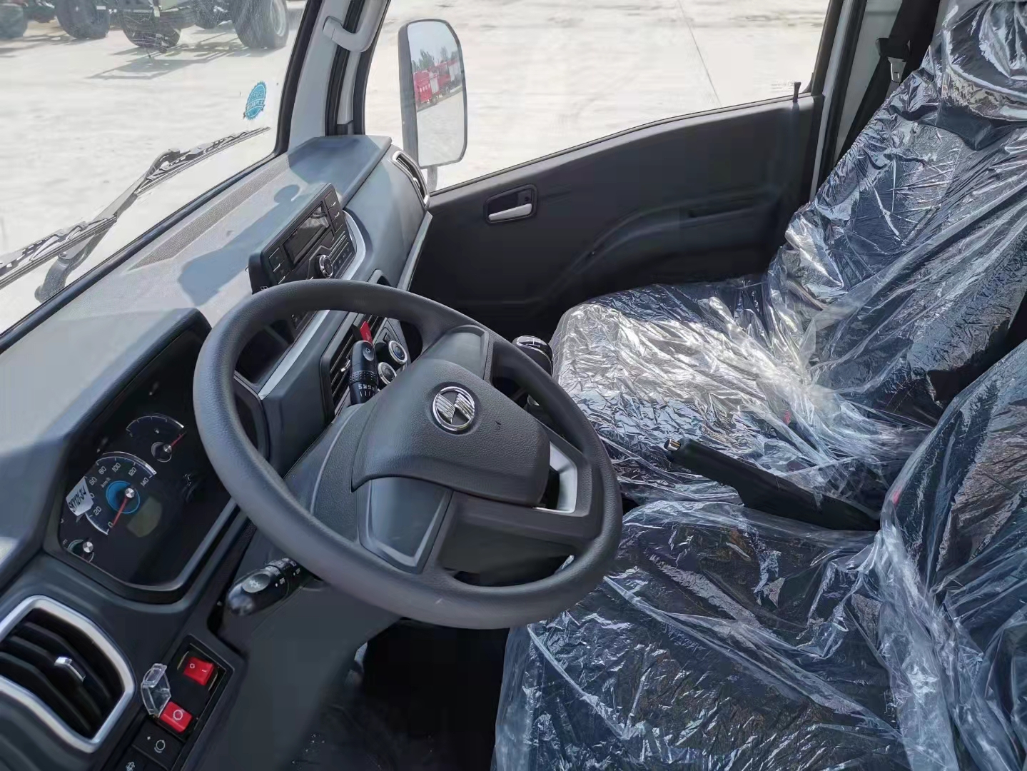 躍進柴油國六帶前開側門民爆車內飾部分配置也是相對齊全的,但像花紋底板、頂通風、10寸觸摸屏、皮+布座椅、自調隙、自動感應大燈、高配儀表等配置還是需要需安裝,卡友可根據自身想用車需求選擇。不得不提的是,全新設計的駕駛室看起來還是非常讓人舒服。