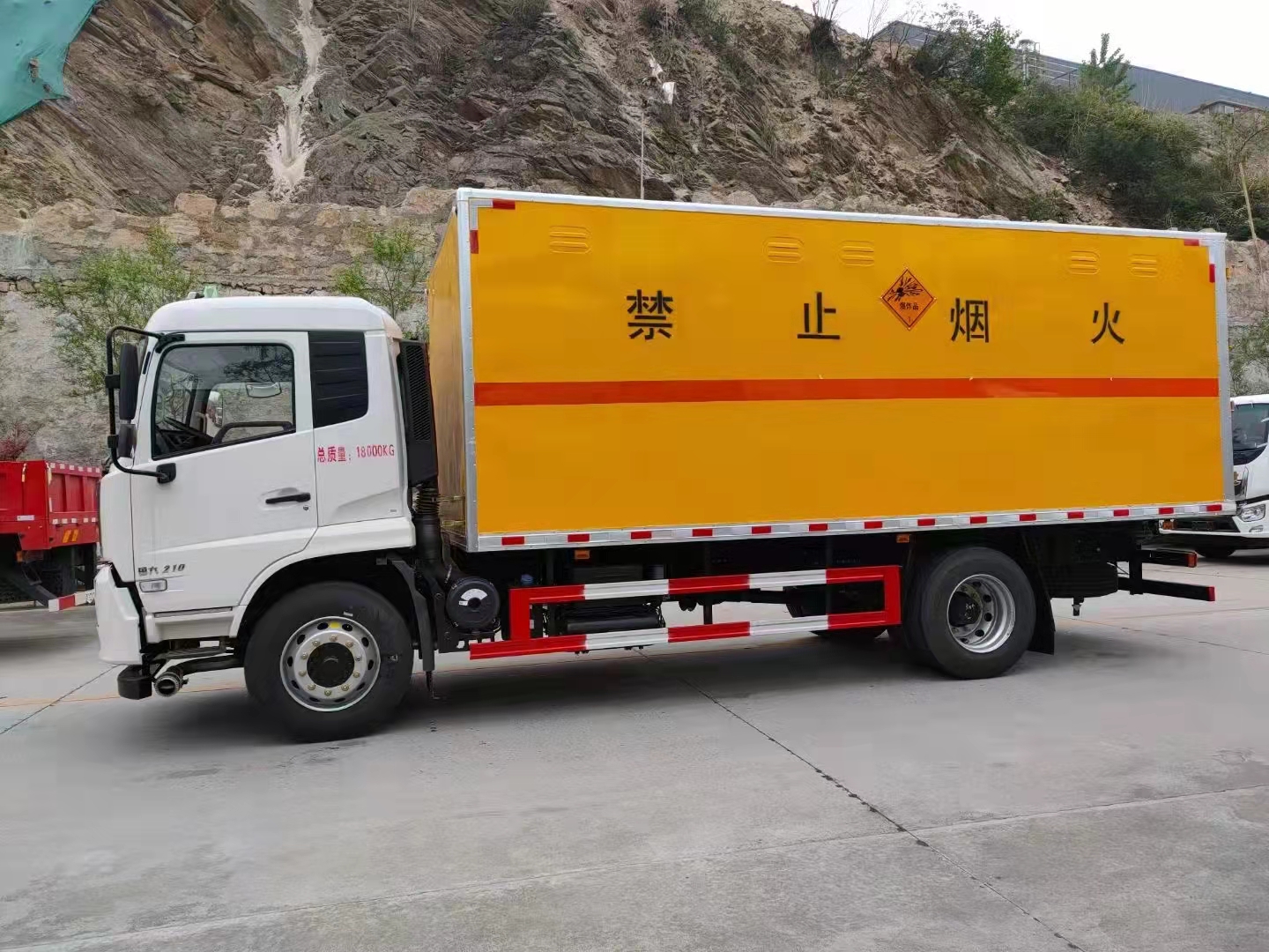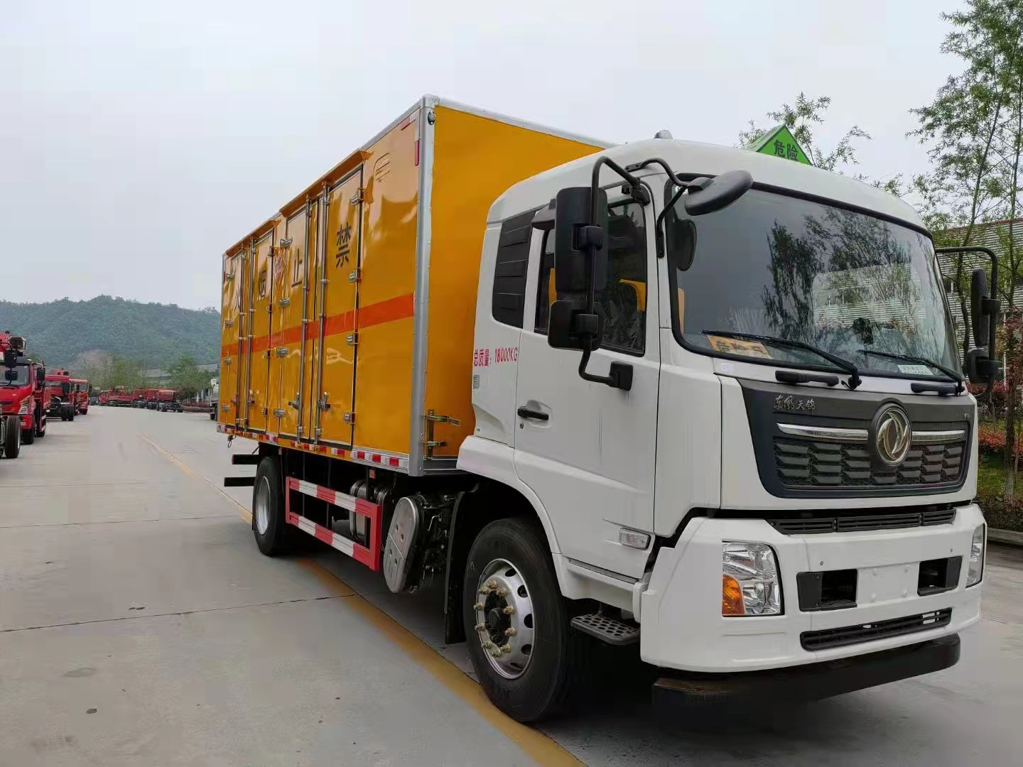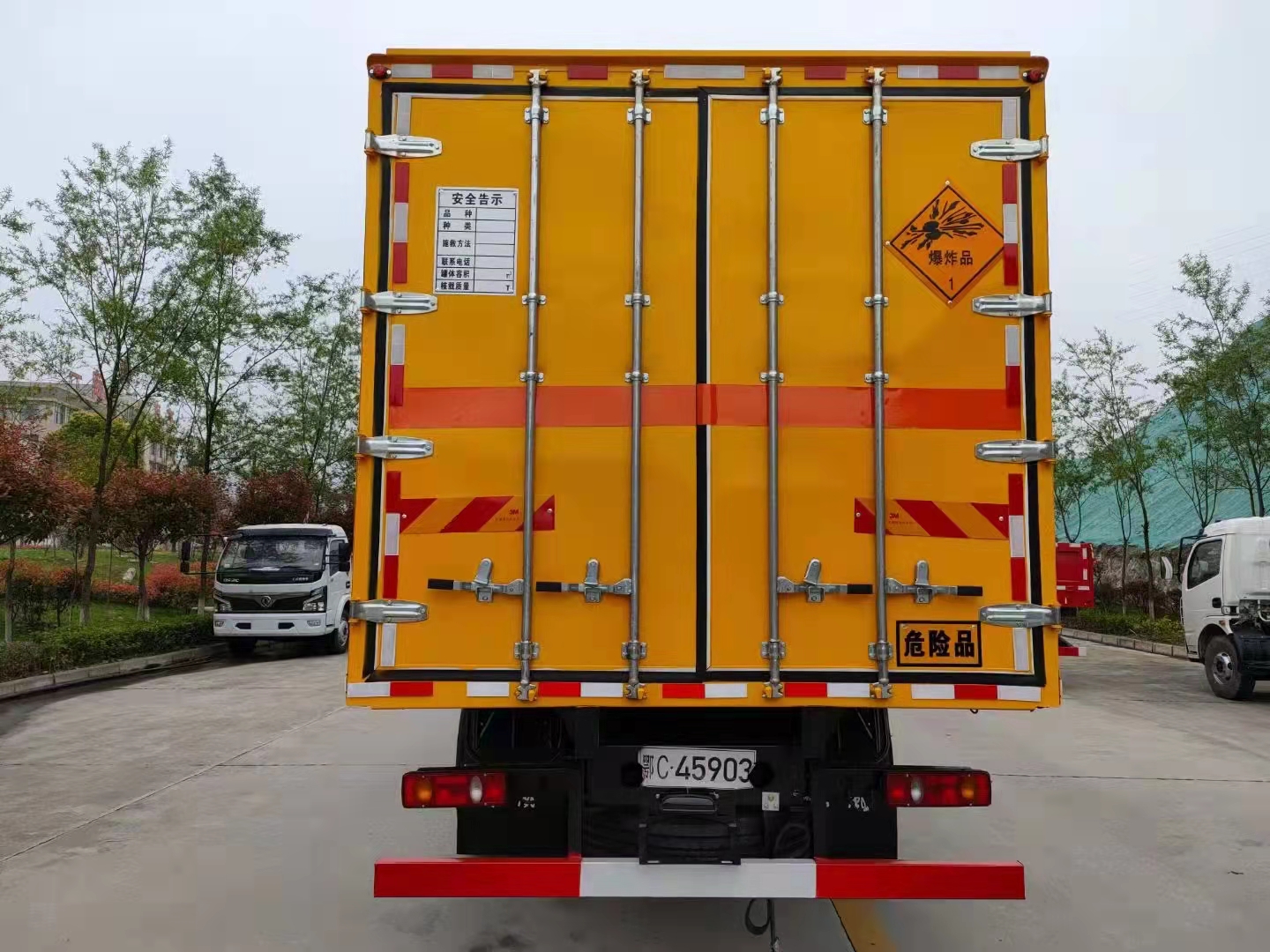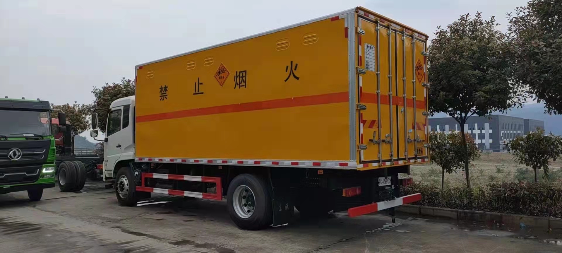 東風(fēng)天錦帶雙開側(cè)門民爆車外板采用免漆板有一次性沖壓成型的百葉窗,內(nèi)飾為導(dǎo)電性能良好的合金板有透氣孔,復(fù)合加鉚合工藝,內(nèi)襯為矩形管骨架牢靠穩(wěn)定,骨架內(nèi)部填充為透氣防潮阻燃材料。廂體外部四周鋁合金型材包邊,底板和車廂前下部鋪橡膠皮,后門雙開,右側(cè)雙開雙側(cè)門,內(nèi)部裝固定貨物的臥環(huán),安裝煙霧報警器、防盜感應(yīng)器。車身附件靜電接地帶、滅火器、防火罩、危險品三角燈、橙色反光帶、CCC反射器、菱形標(biāo)志牌、危險品牌、安全告示齊全。 顏色定制的是黃色,在眾多危險品車中非常顯眼。