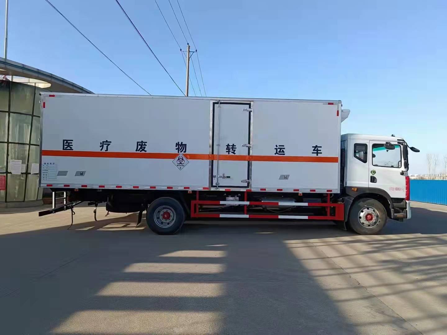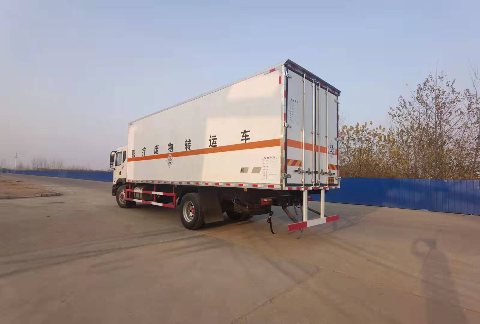東風D9國六醫療廢物轉運車廂體外玻璃鋼內不銹鋼,中間填充高密度保溫材料,后門為雙層密閉結構,并采用迷宮式封條,使車廂完全封閉。箱內安裝卡槽,地漏帶污水箱,廂內安裝紫外線消毒燈,加裝自動消毒噴霧器(噴頭安裝在箱內頂部)。車廂體內裝配紫外線消毒殺菌設備。醫療廢物轉運車采用帶有“醫療廢物”標識。整車帶零下5度機組,嚴格按照公告生產。