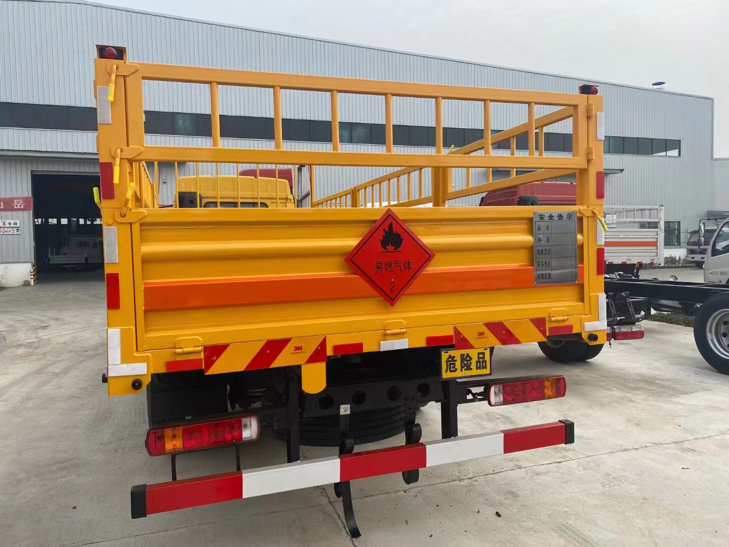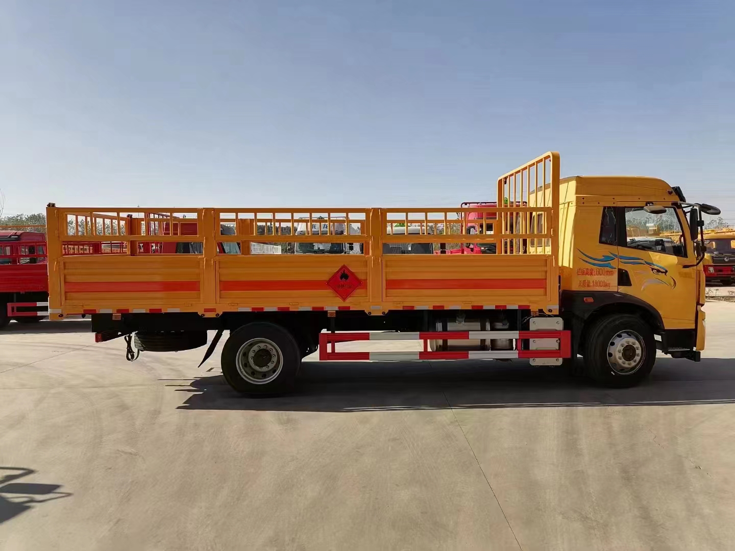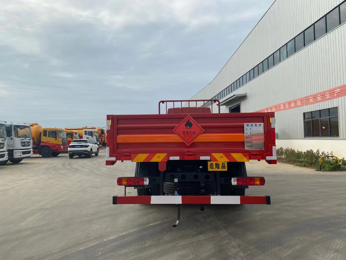 解放龍V國六6米7黃色氣瓶車箱體采用的是可拆卸式倉欄式結構,車廂欄板高度600mm,帶上花欄接近1.2米,底板4mm鋪設靜電膠皮,尾部可帶尾板整車不超重,該車支持定制,裝載噸位可達10噸。該車可定制黃色、紅色、藍色,客戶可根據自身需求進行選擇。以下是紅色車輛實拍圖片:
