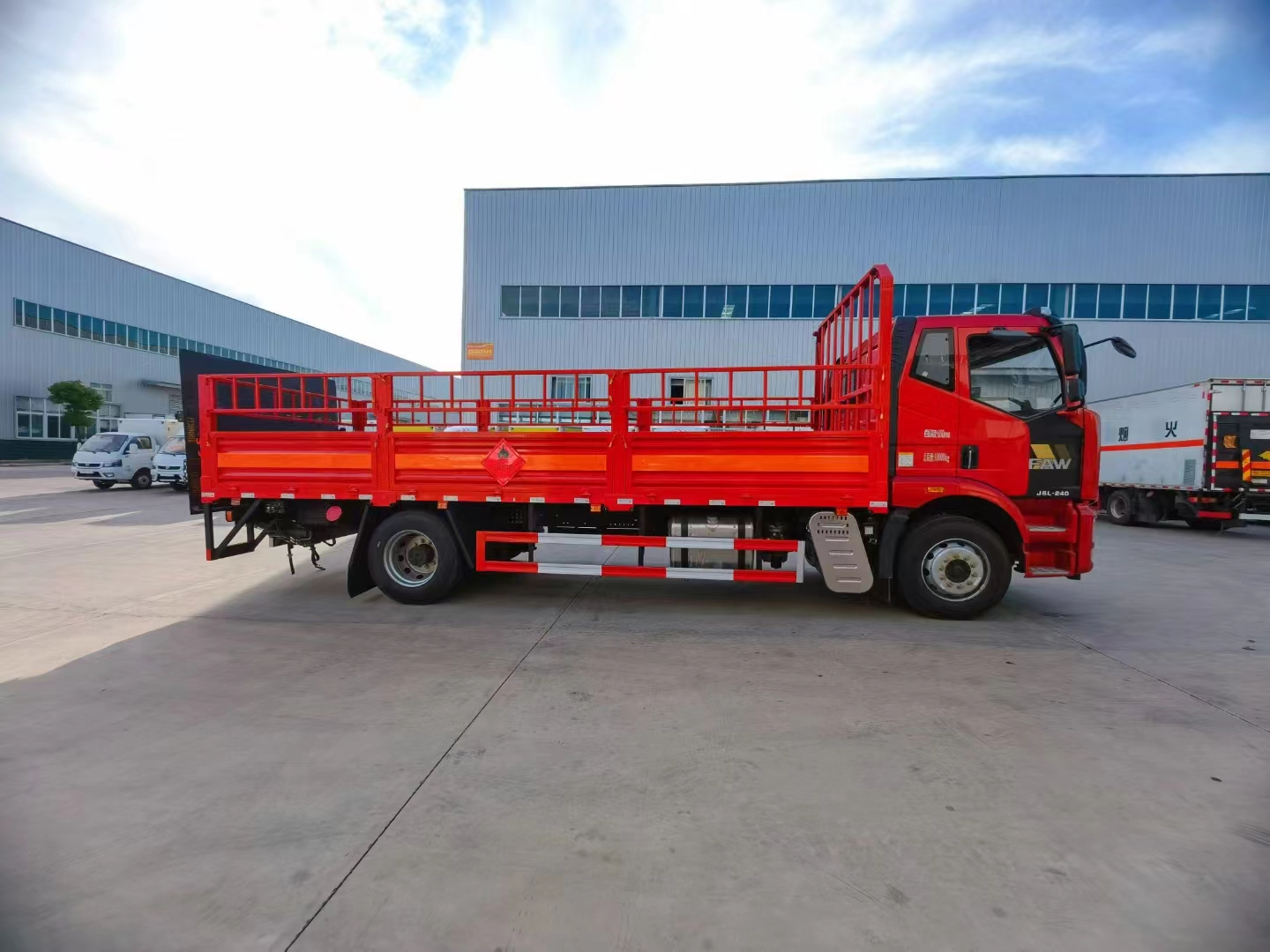 解放J6國六240馬力高頂雙臥氣瓶車廂體采用的是邊板冷板,底板標配花紋鋼板,底板上方鋪靜電膠皮,選裝可拆卸護欄,立柱可選擇活動內插或死立柱,底板及均做防銹處理,車廂一周粘貼橙色放光帶,箱體粘貼菱形告示牌,安全告示牌,危險品牌,拖地靜電帶,等電位連接。箱體采用雙組份丙稀酸油漆制作,所有合頁均為熱鍍鋅材質。選裝液壓升降尾板。