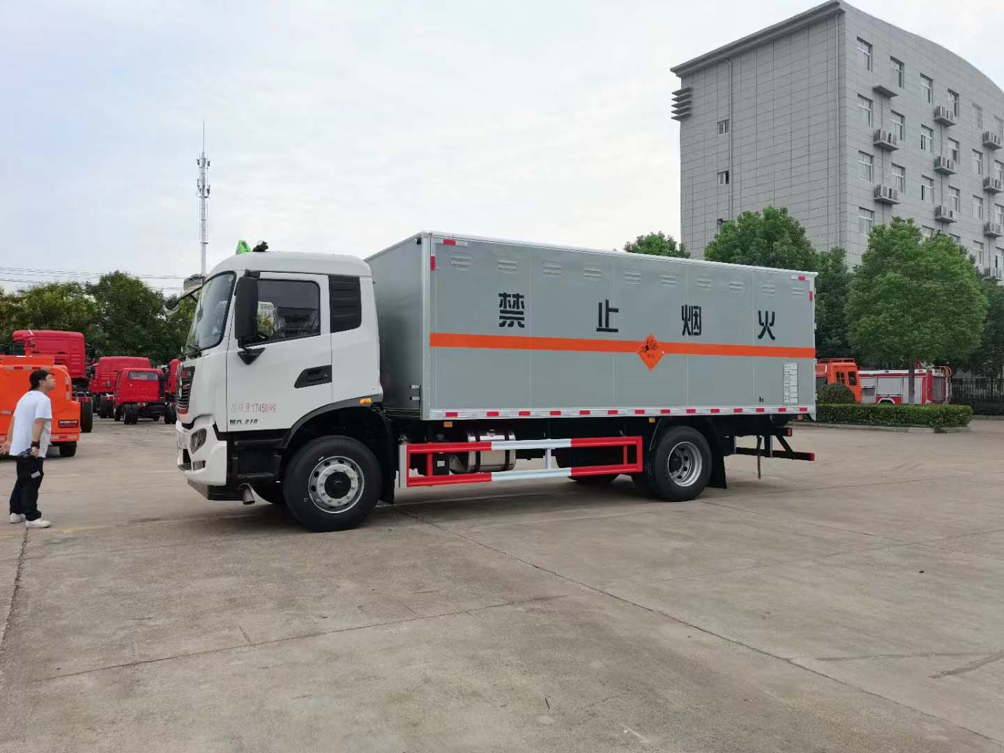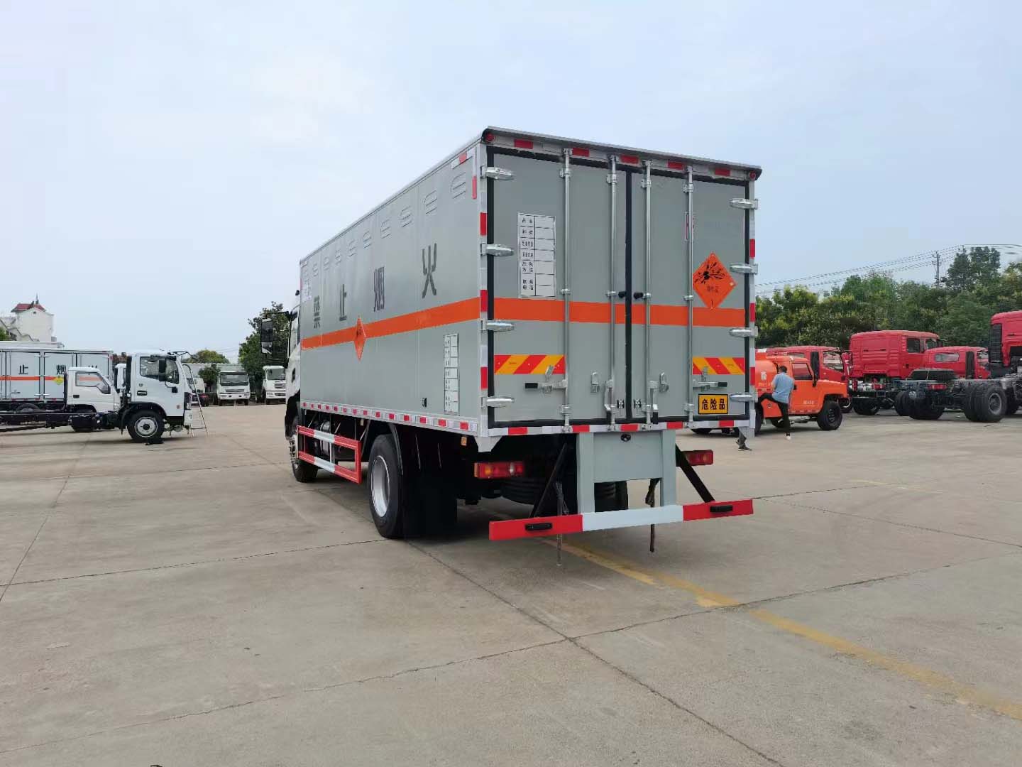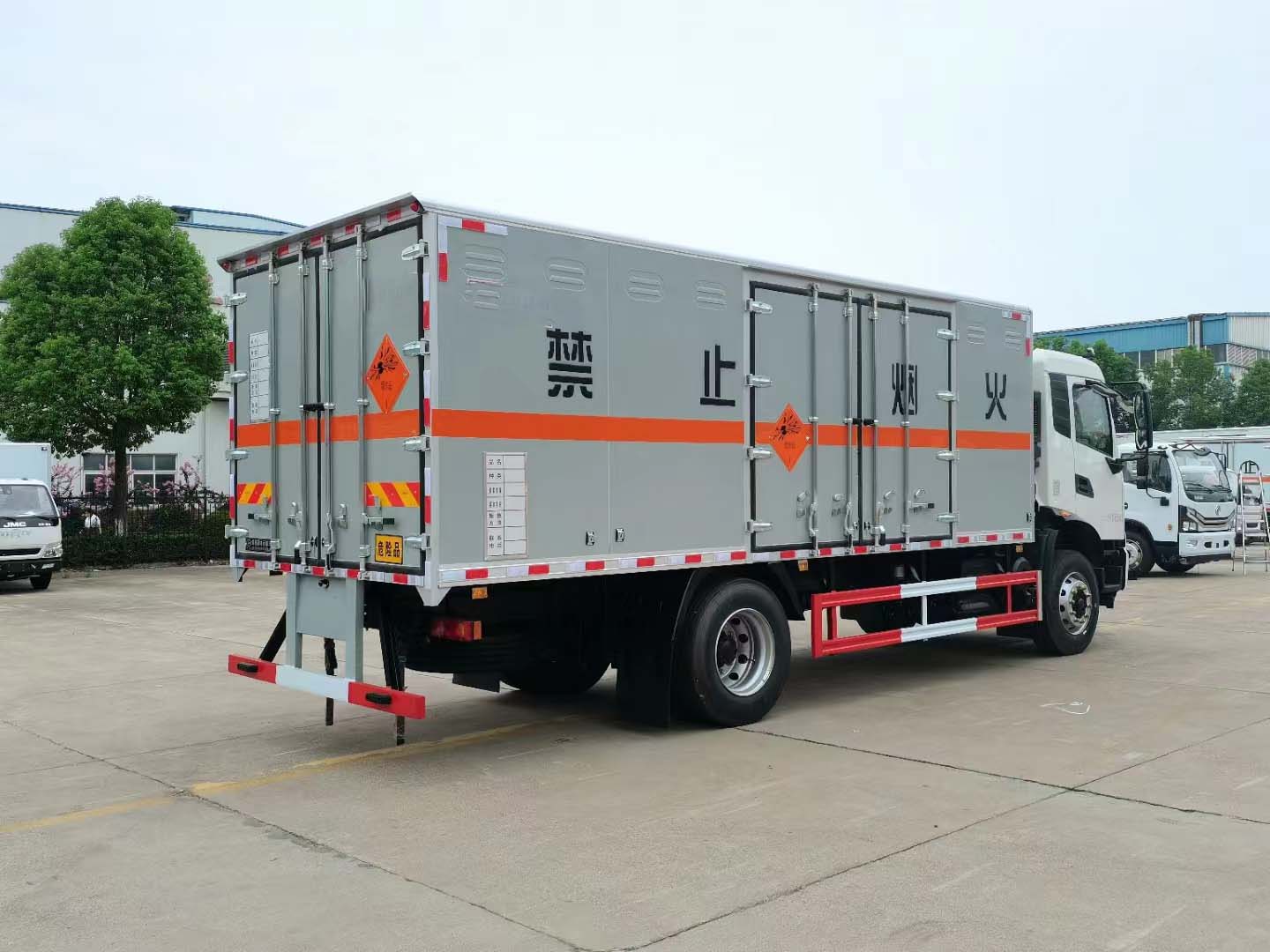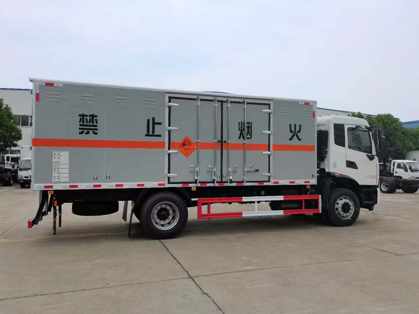 東風天錦10噸爆破車貨箱尺寸可選6米2或者6米6,寬度2米4,正好放2個1.2米托盤。外板采用的是專用的防爆箱體,底板鋪碳鋼板并平鋪靜電膠皮,在底板的包邊全部用鋁合金防止靜電。箱體頂部帶煙霧提示器,帶危險品頂燈、防火帽。
