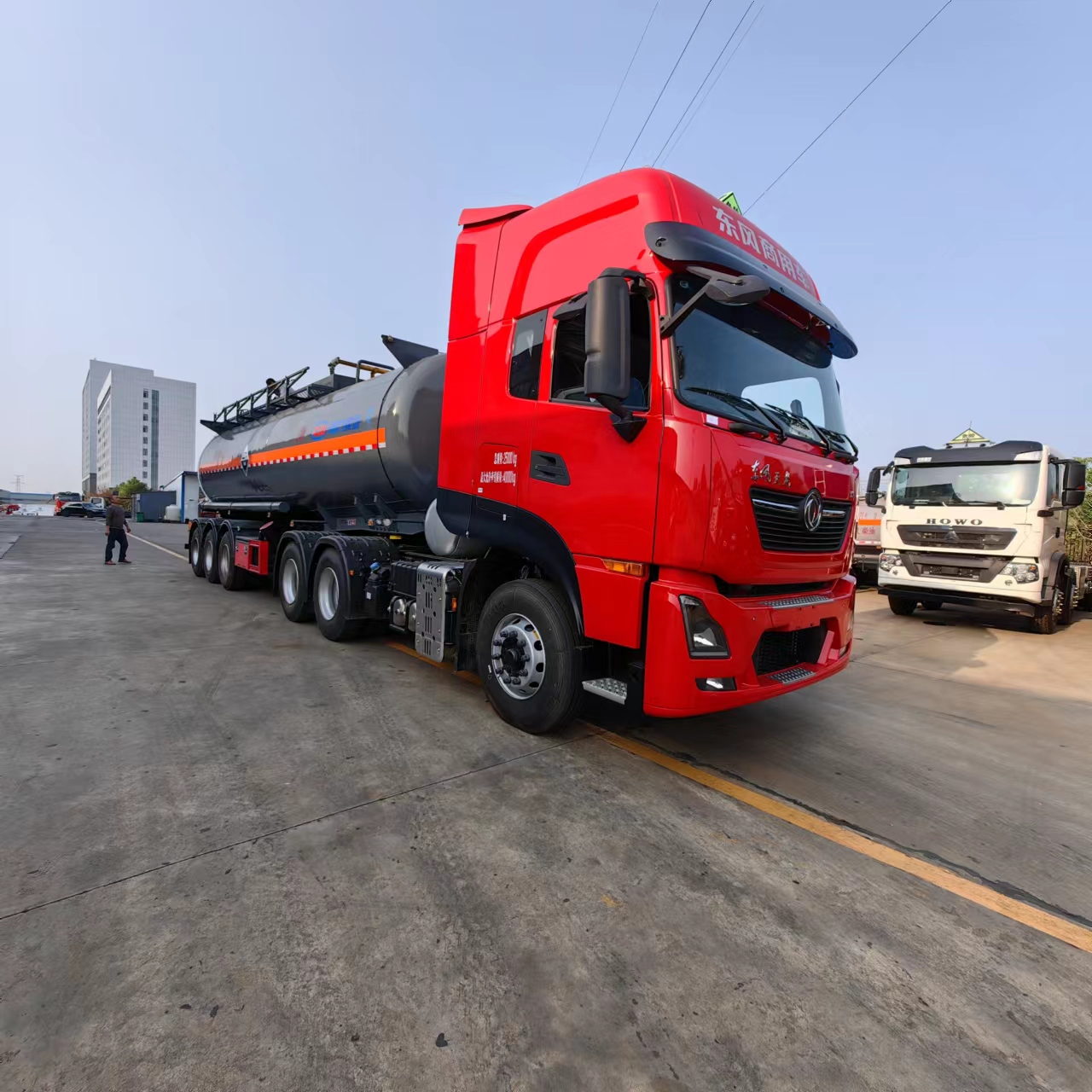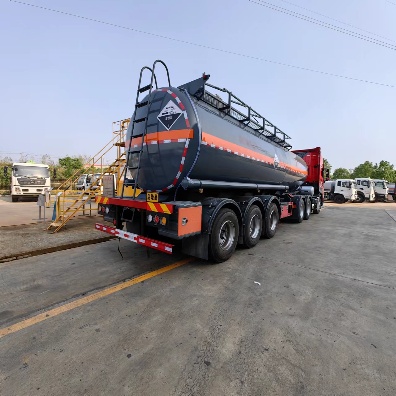 東風(fēng)天龍高頂雙臥半掛腐蝕品運(yùn)輸車采用的是10噸富華盤式車軸,帶空氣懸掛,兩軸EBS,塑料樣式防飛濺擋泥板, 12條12R22.5真空胎帶普通鋼圈,50#牽引銷,28噸聯(lián)動支腿,一個(gè)工具箱,一個(gè)備胎架,該車可出介質(zhì):鹽酸,液堿,硫酸,氨水