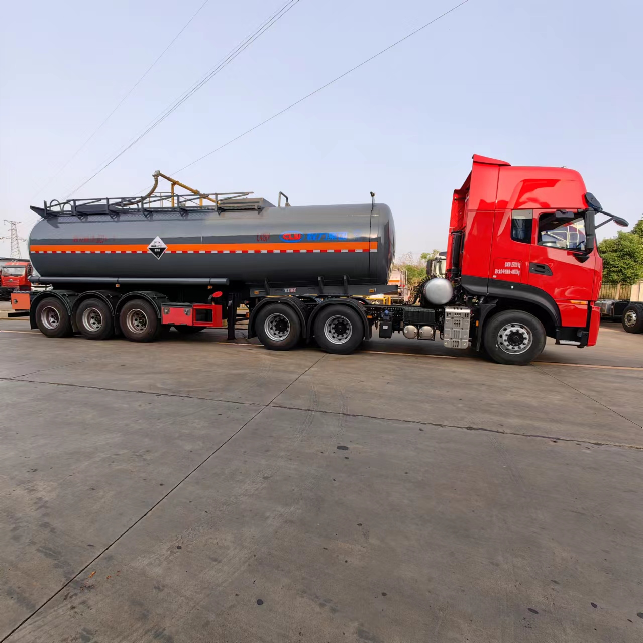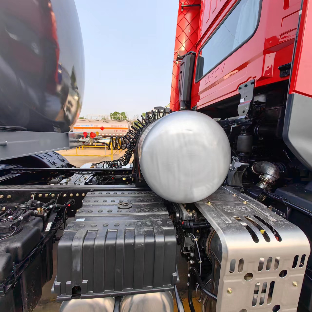 東風(fēng)天龍高頂雙臥半掛腐蝕品運(yùn)輸車罐體采用優(yōu)質(zhì)國標(biāo)Q235碳鋼材質(zhì)制作,筒體厚度封頭厚度按GB18564-1設(shè)計(jì),罐體內(nèi)部襯聚乙烯16mm厚。罐頂單圍板,圍板內(nèi)做防腐處理,兩側(cè)鐵質(zhì)活動護(hù)欄,罐頂兩個(gè)全塑進(jìn)料口帶接酸盤(采用標(biāo)配子口直徑為250mm),罐頂做落水管引至后封頭落水。罐體單倉,罐體內(nèi)防蕩隔板按技術(shù)設(shè)計(jì)。罐體底部一個(gè)DN100氣動不銹鋼襯四氟海底閥總控帶緊急切斷開關(guān)后保險(xiǎn)杠控制(加裝5公里報(bào)警裝置),通過三通鋼襯塑管道,后尾部左右各一個(gè)DN80 鋼襯塑球閥帶DN80 PP出口,出口帶全塑保護(hù)箱。罐體兩側(cè)為PVC炮筒管,2根耐酸卸料軟管,2只8KG滅火器,罐體活動爬梯按公告圖片制作,三塊安全告示牌,按公告圖片張貼3M反光條、反光帶及腐蝕品標(biāo)識。罐體顏色:深灰色,整車外觀及尺寸嚴(yán)格按照公告圖片制作。