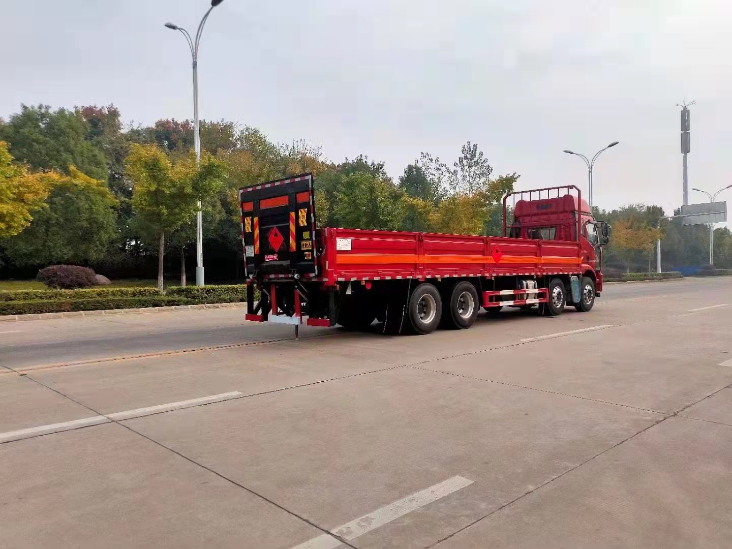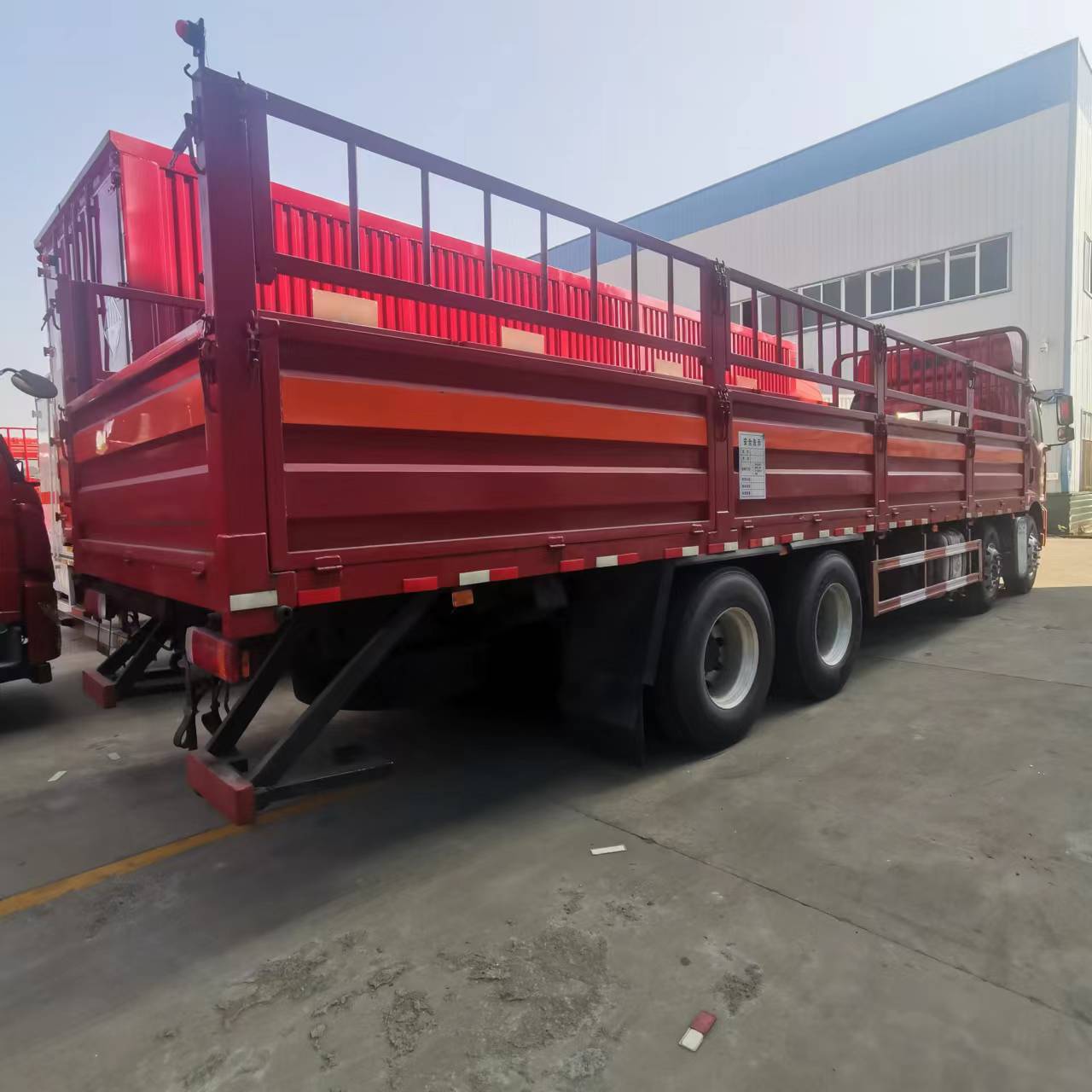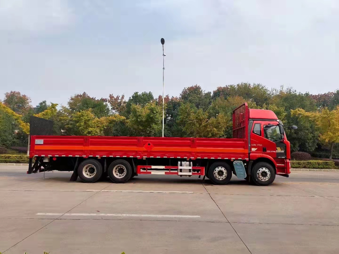 解放J6L前四后八氣瓶運輸車采用的是專用的瓦楞板,底板為5mm厚花紋板,標配底部靜電膠皮,選裝低欄或者活動護欄,隨車配有靜電帶,滅火器,防火帽,危險品三角頂燈。整車國標反光標示及警告標志。