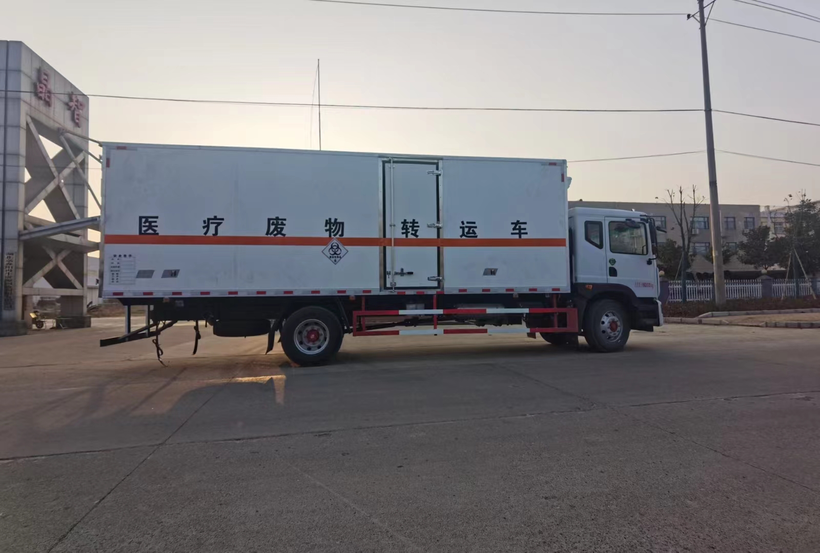 東風D9國六6米8醫療廢物轉運車采用的是東風D9國六危險品車專用底盤,康明斯220馬力發動機,9噸后橋,帶中控鎖、電動門窗、原廠空調,方正的駕駛室,采用的是專用箱體,內外玻璃鋼,中間夾防阻燃材料,箱體內部帶不銹鋼內飾,頂部帶消毒設備及紫外線消毒燈。箱體內部可帶卡槽,車廂底部帶廢液收集箱。