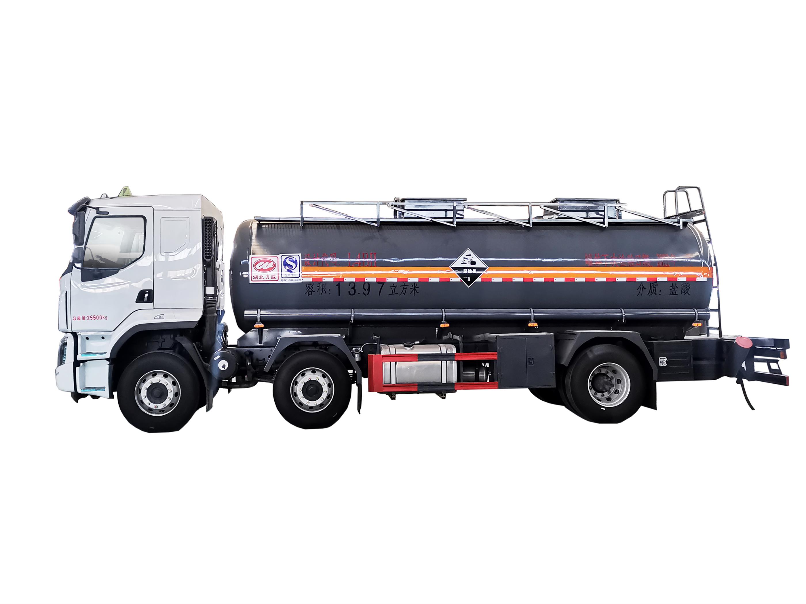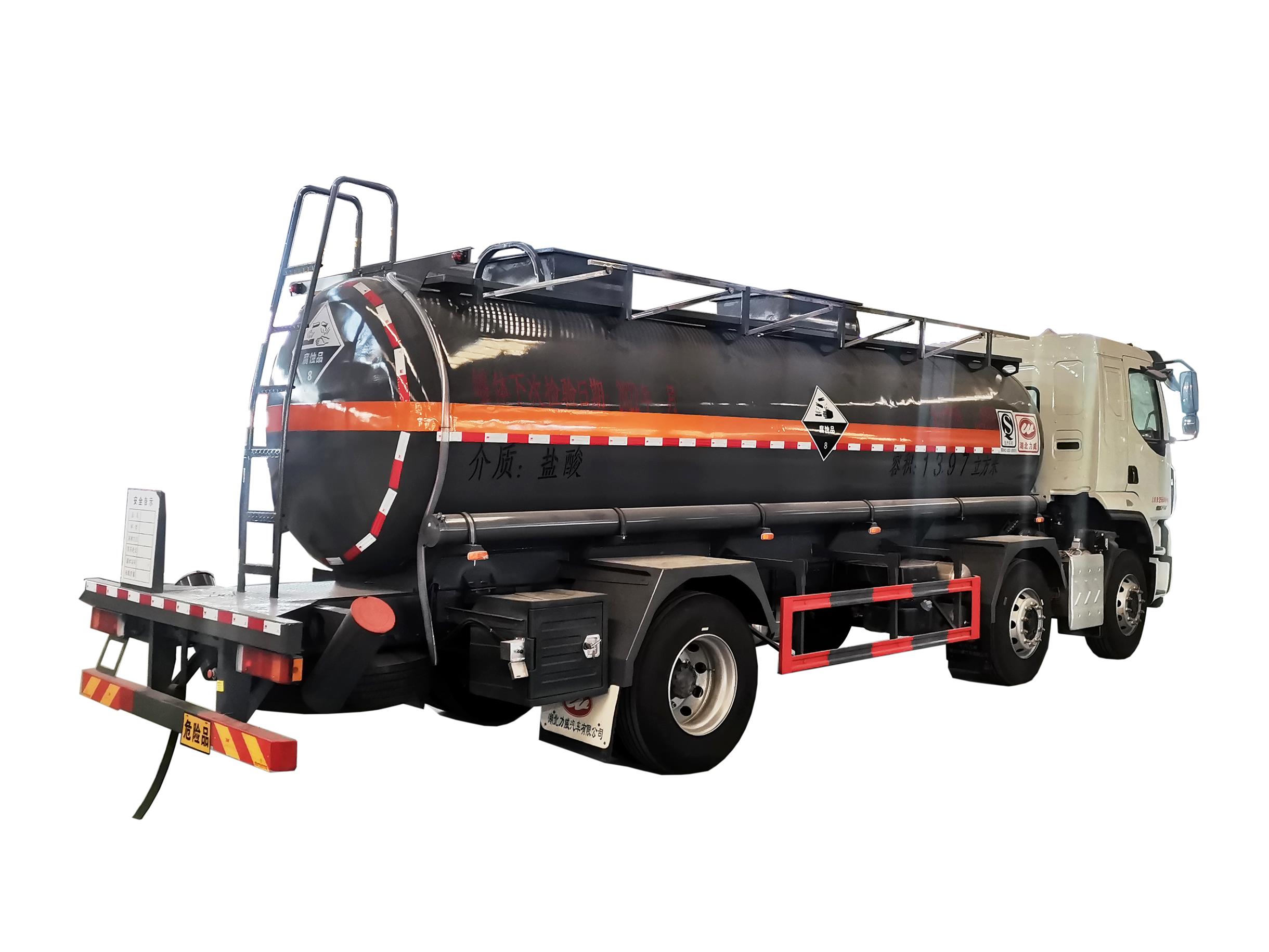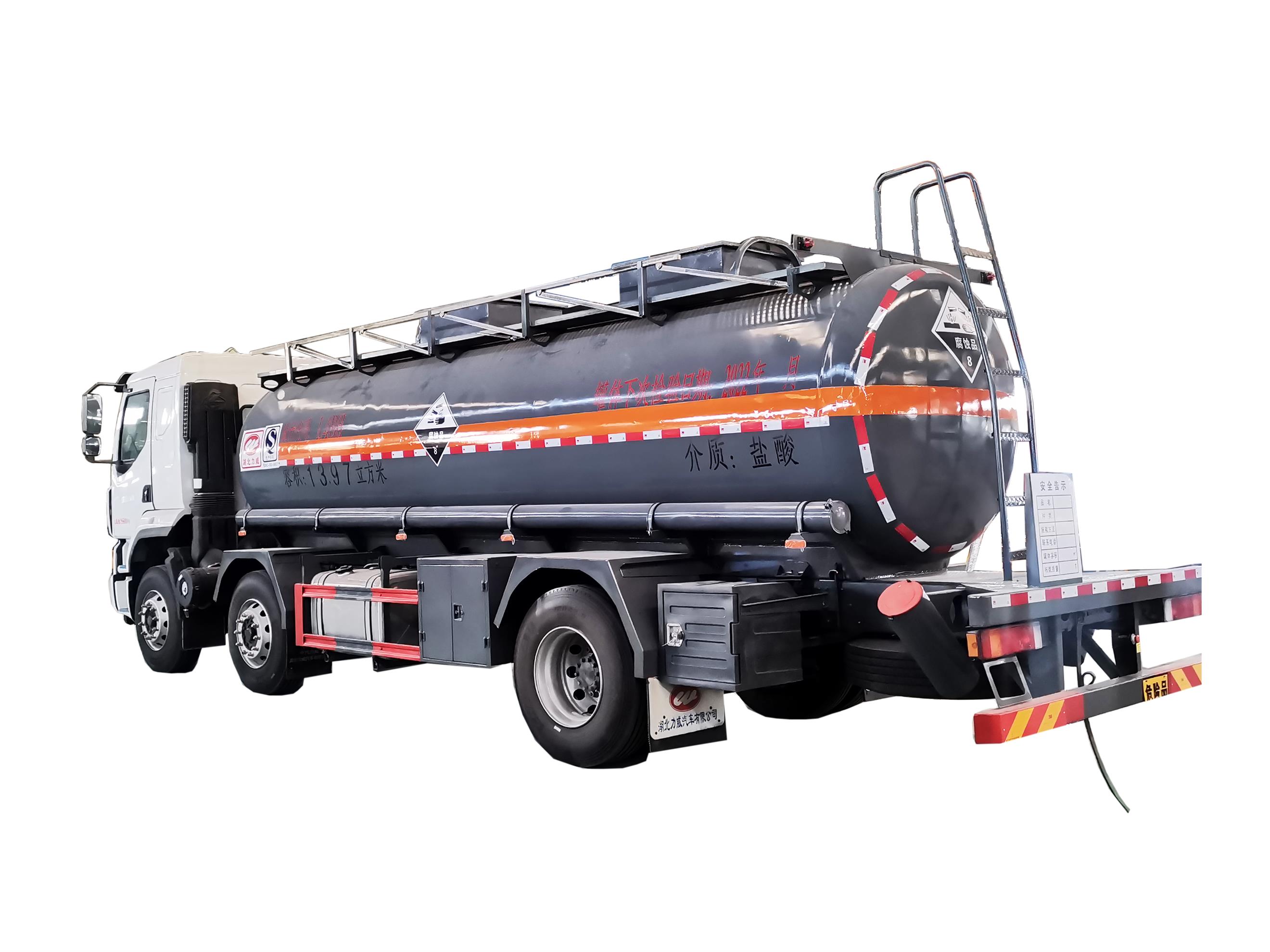 柳汽國六15噸腐蝕品罐式車可運輸鹽酸、硫酸、烯硝酸等八類危險品,罐體襯塑可多選,該車支持定制、罐體可選不銹鋼、碳鋼罐等多種形式。