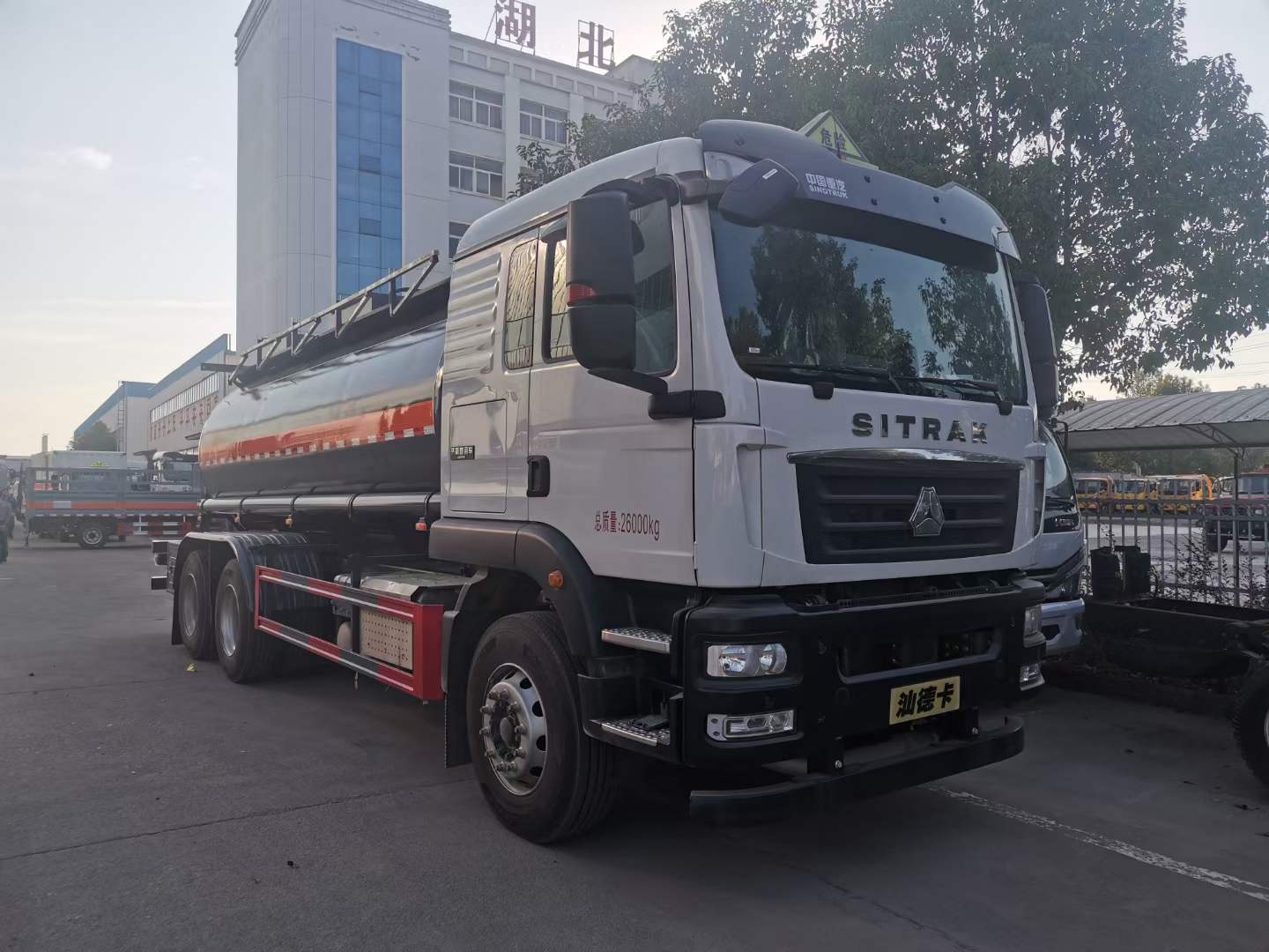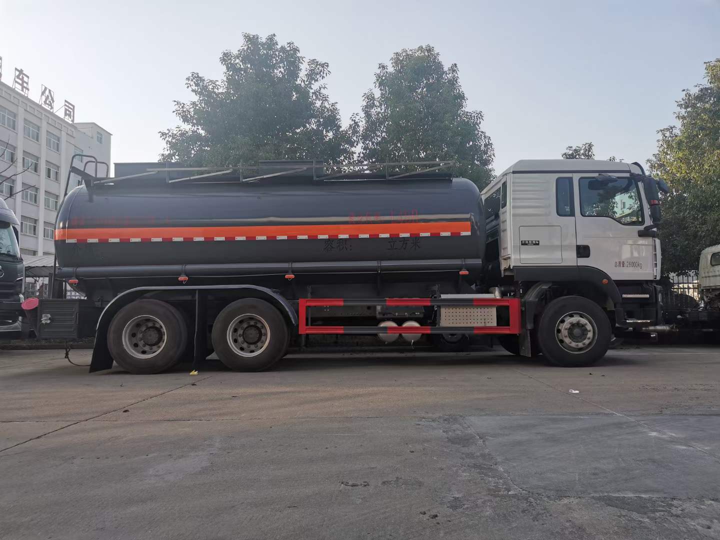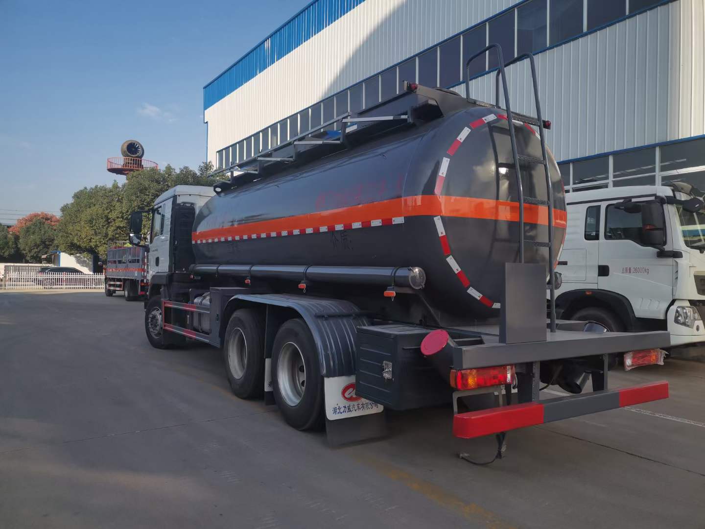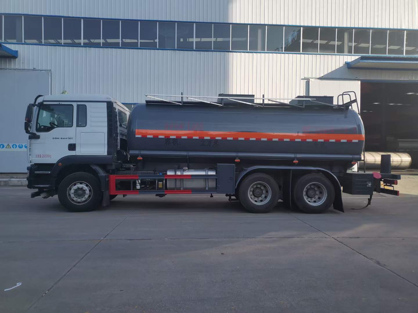 重汽汕德卡后雙橋腐蝕性物品運(yùn)輸車罐體采用碳鋼Q235按GB18564制作,筒體厚度及封頭厚度符合18564設(shè)計(jì),罐內(nèi)聚乙烯滾塑16MM厚,罐體按國(guó)家標(biāo)準(zhǔn)采用圓型狀截面,罐頂單層圍板,圍板內(nèi)做瀝青漆防腐,罐頂兩側(cè)帶碳鋼活動(dòng)護(hù)欄,罐頂安裝2個(gè)罐口帶全塑罐蓋,帶接酸盤,接酸盤和罐頂做落水管引至后封頭落水,罐體底部底口位置加裝一個(gè)DN100不銹鋼襯氟海底閥帶緊急切斷裝置(加裝海底閥語(yǔ)音報(bào)警裝置),采用4寸無縫管/出料管道內(nèi)滾塑,后尾左右自流各配一個(gè)DN80 鋼襯塑球閥帶DN80 PP出口,出口帶塑料保護(hù)箱.罐體兩側(cè)為全塑炮筒式卸料管,配兩條和罐體一樣長(zhǎng)的卸料鋼絲軟管2條,2個(gè)4KG滅火器,工具箱一個(gè),在罐體左右、后正中部加貼“腐蝕品”標(biāo)識(shí)及“腐”字,油漆國(guó)標(biāo)深灰色,整車左右以及后尾部各一塊安全告示牌,后爬梯,整車左右擋泥板及所有附件安裝均按公告圖片制作.