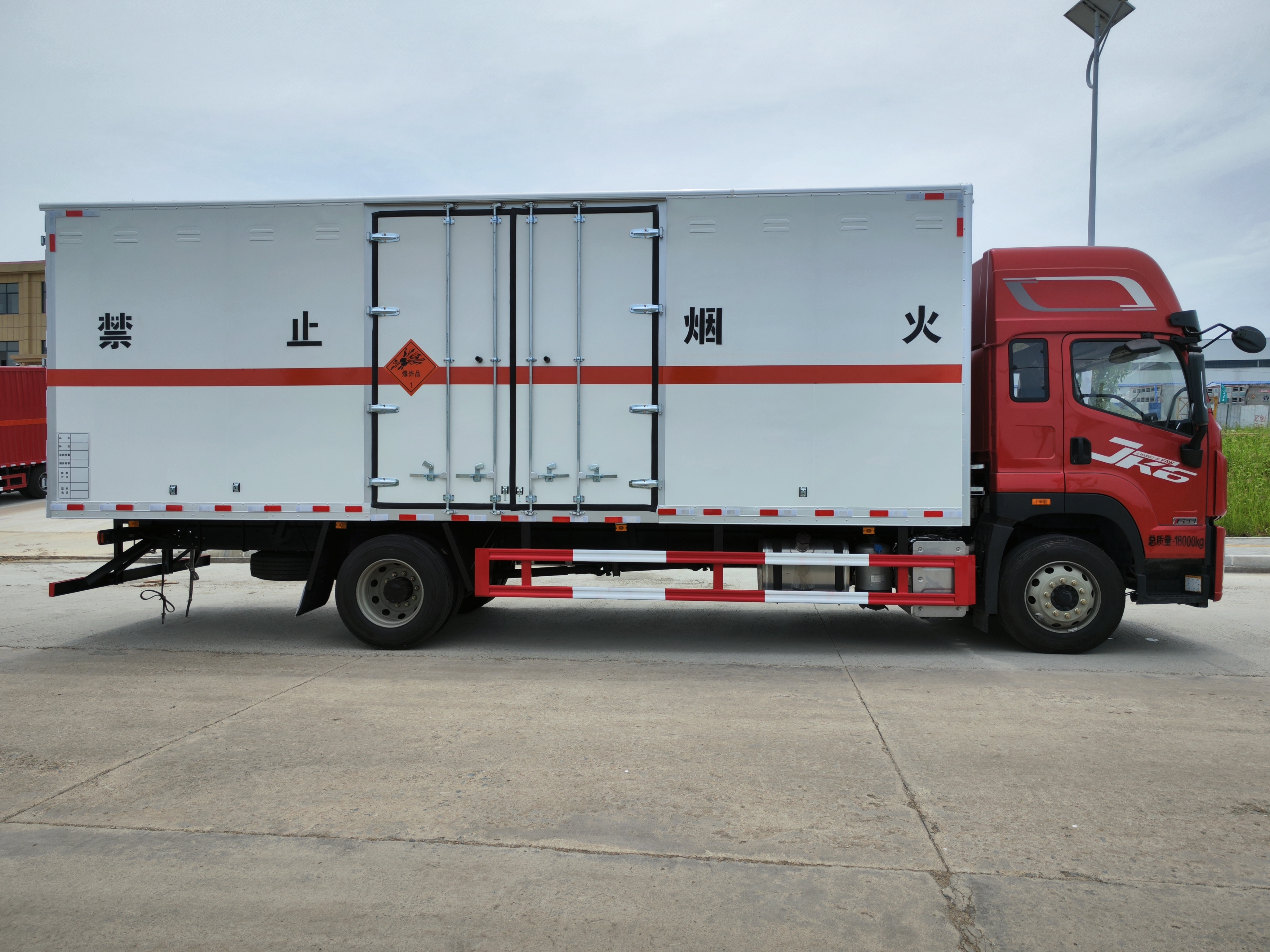 解放JK6國六7米8爆破器材運輸車箱體采用的是烤漆工藝,可選左右開門,可帶液壓尾板,整車不超重。該車箱體帶左右開門,裝載噸位可達10噸,側門全開的形式,裝貨更方便。貨箱采用的是免漆鋼板一次性沖壓成型的百葉窗,內飾為導電性能良好的合金板有透氣孔,內襯為矩形管骨架牢靠穩定,骨架內部填充為透氣防潮阻燃的擠塑板。廂體外部四周鋁合金型材包邊,底板和車廂前下部鋪橡膠皮,后門雙開,右側選裝側開門,內部安裝固定貨物的臥環或腰欄,安裝煙霧報警器、防盜感應器。車身附件靜電接地帶、滅火器、防火罩、危險品三角燈、橙色反光帶、CCC反射板。