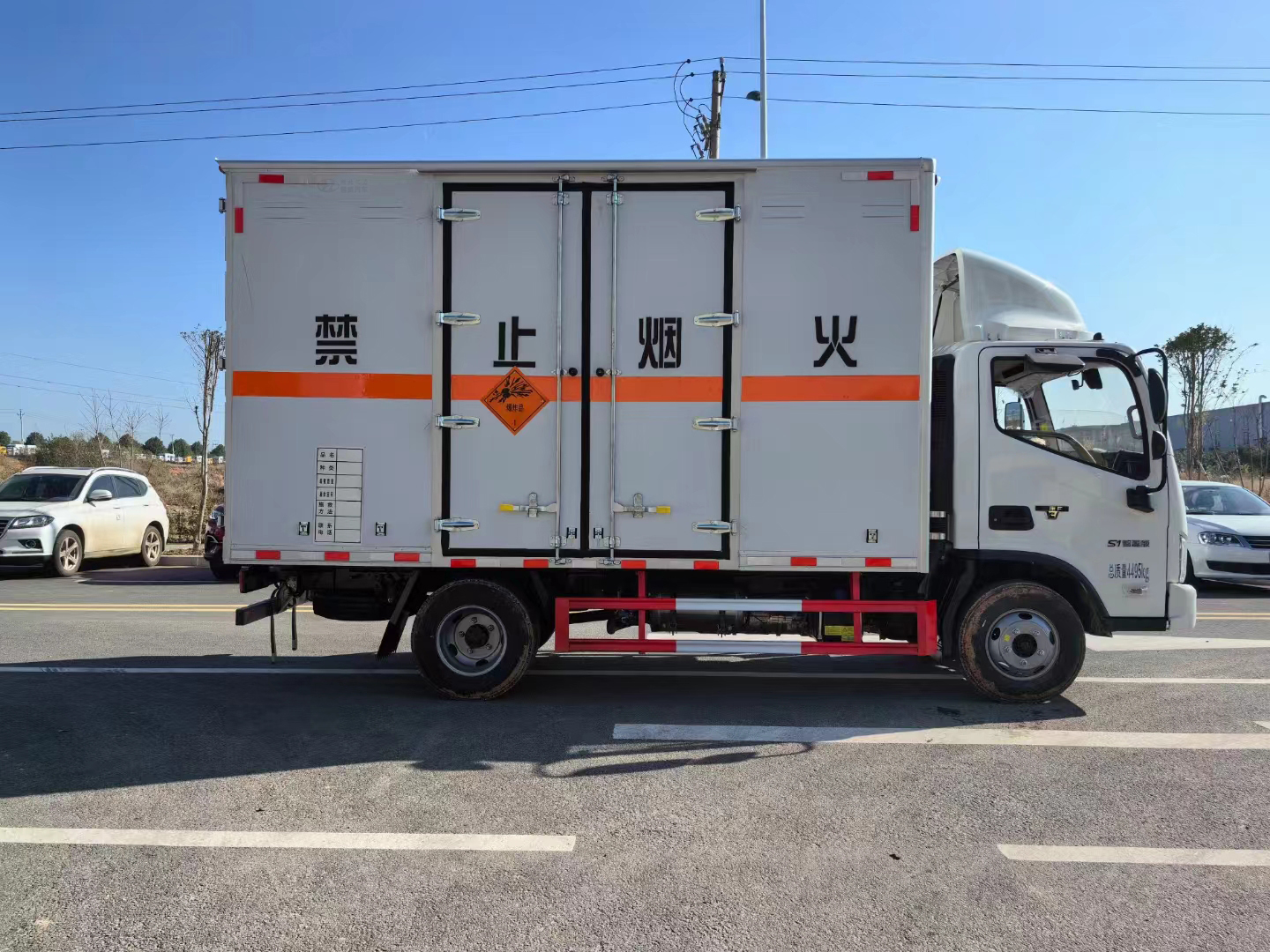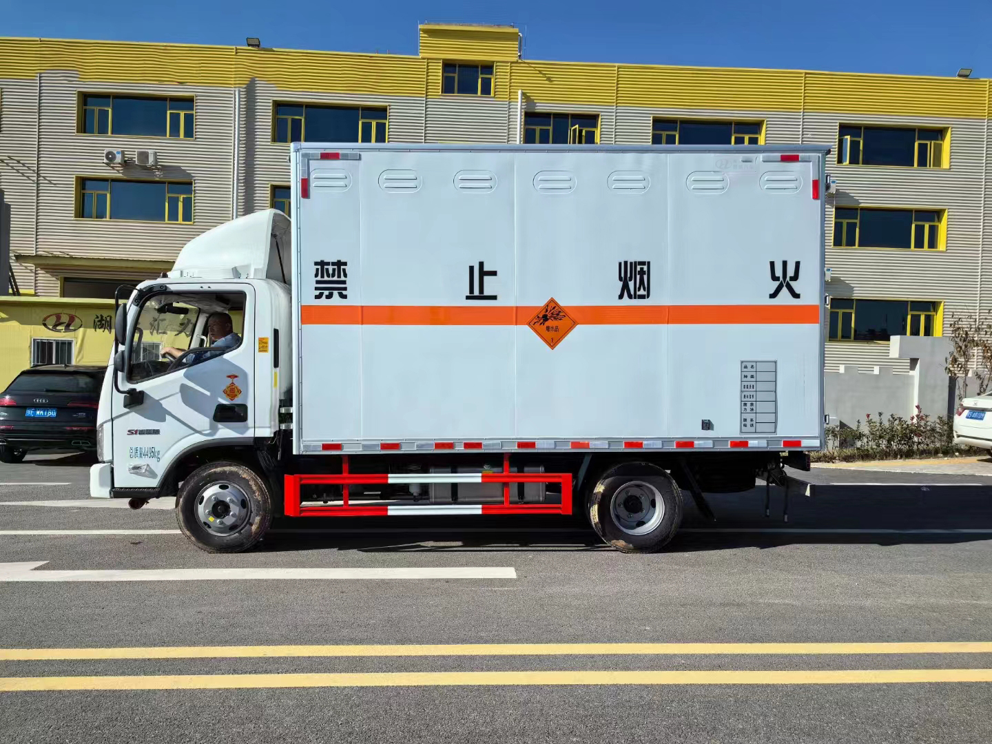 福田歐馬可國六帶導流罩危爆車采用的是專用危險品車底盤,康明斯131馬力發動機,原廠空調,寬體3人座駕駛室,承載力更強。為了使用更省心。該車箱體寬敞,容積可達20立方。貨箱尺寸:4150*2100*2300mm。箱體選用了專用復合帶阻燃箱體,側門可多選,可帶一個雙開側門和單開門,重點是尾部可加裝液壓尾板,整車不超重。