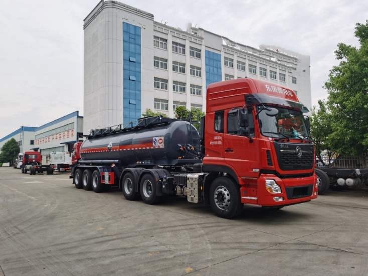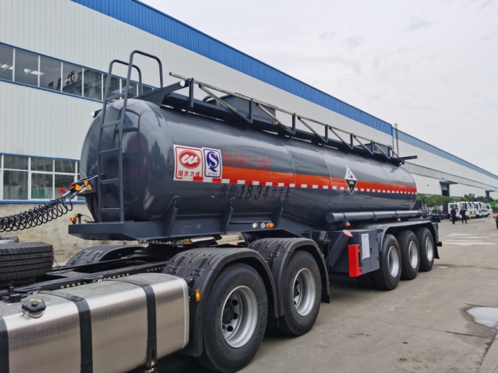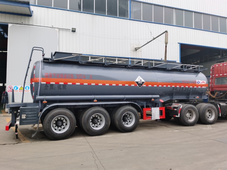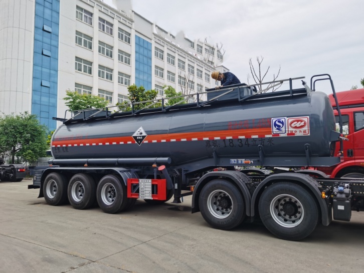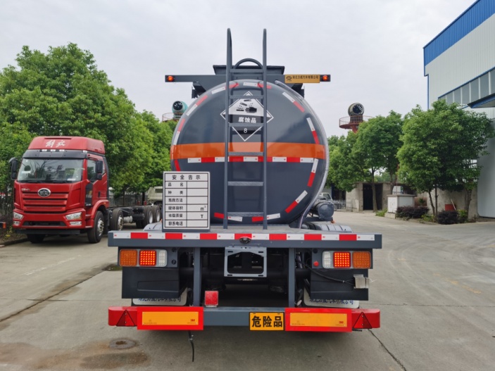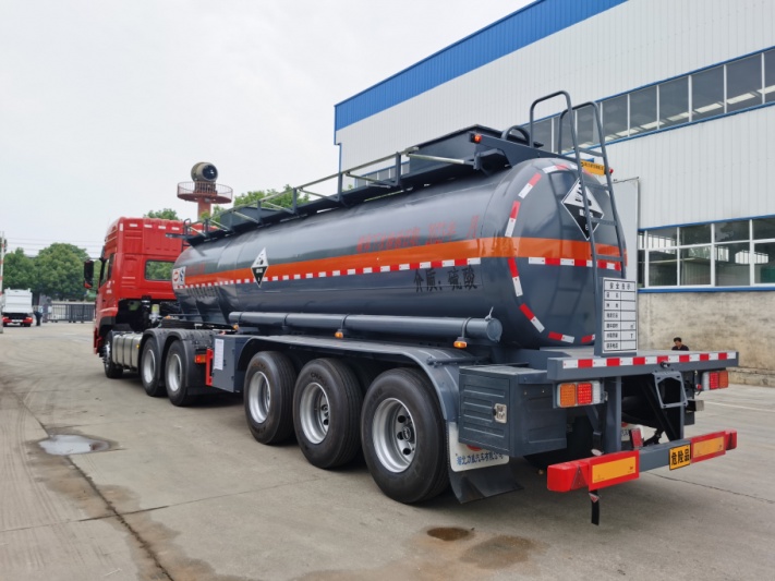 拉硫酸專用腐蝕品半掛車嚴格按照公告圖片及公告尺寸制作,整車型號為:HLW9401GFWA,罐體總容量:18.34立方米。罐體材料為Q235B型碳鋼板材,筒體厚5.5mm,通倉,兩個普通碳鋼罐口帶接酸盤,罐口周圍帶方形保護箱(內做防腐處理),一套不銹鋼安全閥,罐體尾底部帶一個DN100不銹鋼海底閥(海底閥帶聲光報警裝置),罐體尾部左右各一個304不銹鋼自流口,用DN80型304不銹鋼球閥控制,帶全塑保護箱,大梁下出料。全車4寸不銹鋼管道,罐體頂部左、右側帶活動舉升護欄,走道,碳鋼后爬梯,兩個滅火器,兩根卸料管(帶不銹鋼陰陽端),其余按廠家標配。
