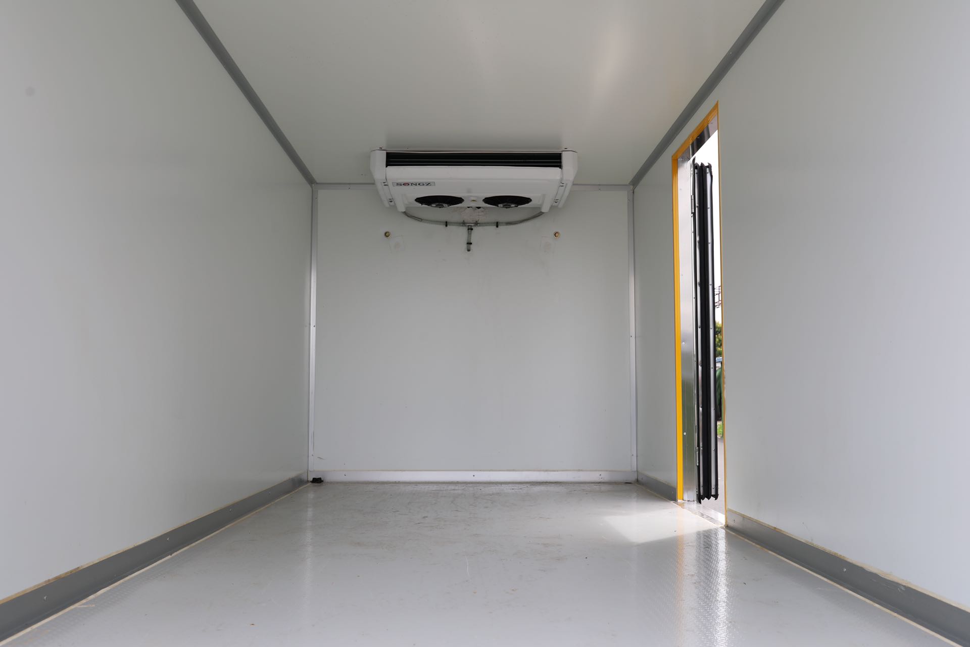吉利3米8國六新能源冷藏車廂體容積10.4立方,整車外形尺寸:5995x1810(1950)x2730mm,車廂內部尺寸:3820x1650(1790)x1650mm。185R15LT 8PR輪胎。單排駕駛室、液晶儀表盤、電動空調、電動門窗、日間行車燈、車聯網、BCM功能(自動落鎖、內部照明延時功能、內部照明自動熄火功能、車門防盜報警)、ABS、T-BXO。該車外形輕巧看起來時尚大氣美觀,選用的是寧德時代磷酸鐵鋰電池,電池容量大。該車續航里程為180-220公里(實際續航)。定制的是永磁同步電機,選用的是液壓制動。