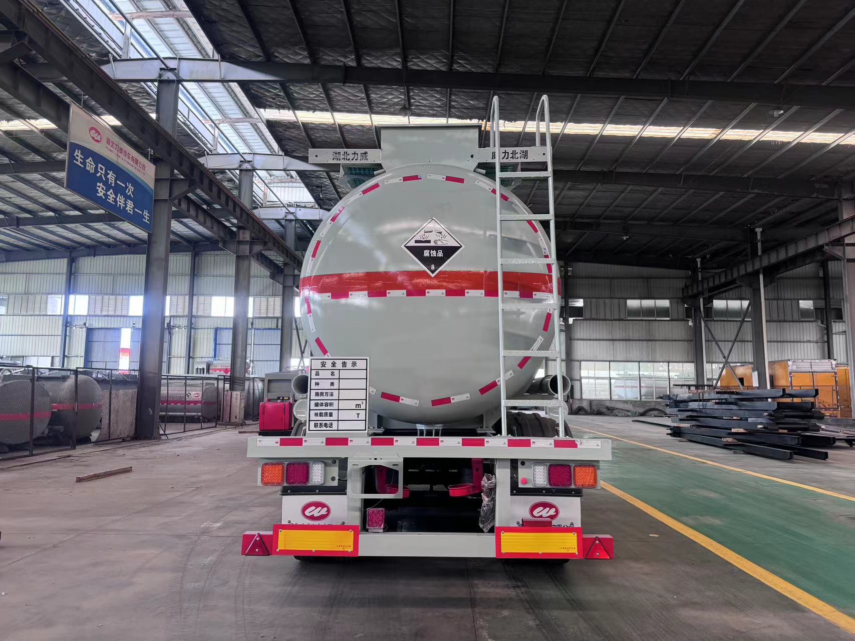 拉鹽酸專用分體式腐蝕品罐式車罐體總容量:28.19立方,額定載質量31150KG,外罐體材質為Q235B型4.2mm厚板材,封頭4.5mm厚,罐體通倉,內襯20mm厚聚乙烯,三道雙層鋼襯塑防浪板,兩個鋁合金歐標罐口蓋,罐口周圍用方盒子式圍邊,圍板內做防腐處理,罐體頂部帶活動舉升護欄,玻璃鋼方格走道,罐體尾底部帶一個DN100不銹鋼襯氟海底閥(海底閥帶聲光報警裝置),罐體后尾部左右各一個DN80襯氟球閥為出料口帶全塑保護箱,大梁下出料,一個工具箱,尾部爬梯。兩根卸料管,兩個8KG滅火器,其余標配。