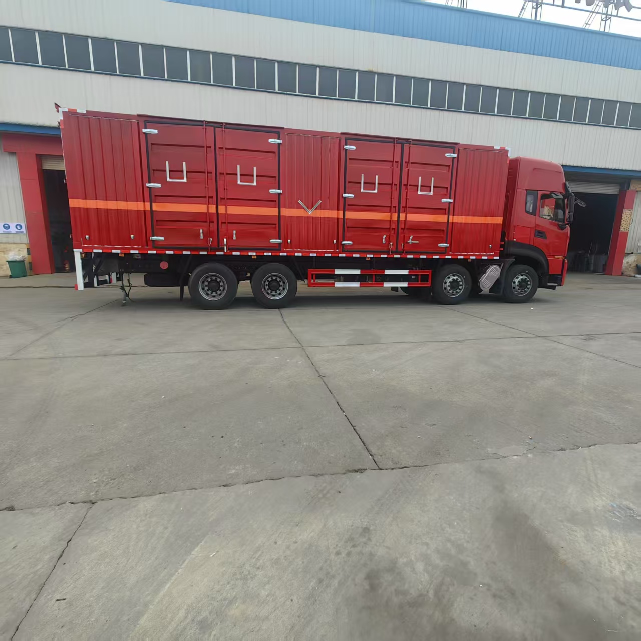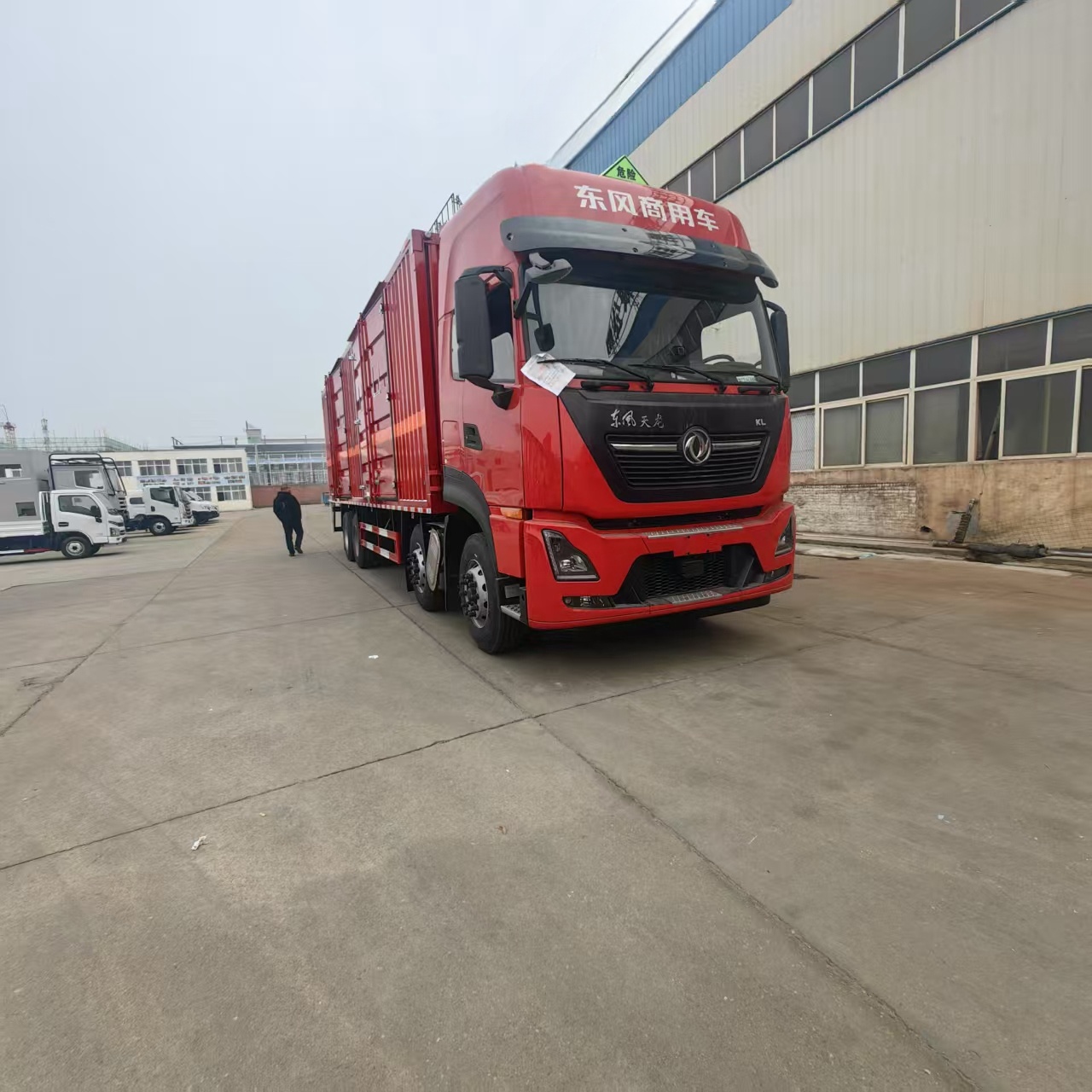 外觀帥氣、性能強勁、內飾舒適、安全可靠。東風天龍前四后八紅色危險品車貨箱尺寸可多選,額載噸位可達20噸,尾部可加裝液壓尾板,整車不超重,讓您用車更無憂!