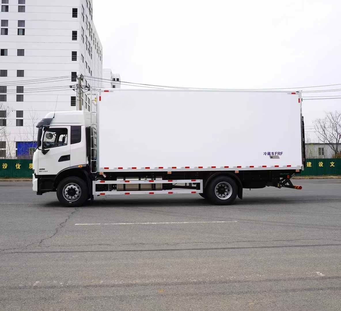 東風天錦KR國六法士特8檔冷藏車選用的是2025款D560KR高頂雙臥駕駛室,法士特8檔變速箱,駕駛室液壓電動翻轉,帶空調,可調節氣囊主座椅,多媒體大屏,多功能方向盤,前后攝像, 前/后橋4.5/9T,大梁220×75×7,板簧片數8/10+8,400L鋁油箱,速比3.64,275/80R22.5 18PR輪胎,140Ah蓄電池,2人座軸距:5000mm,整車型號:DFH5180XLCEX7,整車尺寸:9200*2600*3960(mm),箱體尺寸:6800*2440*2500(mm)。選用的是康明斯290馬力發動機,箱體選用的是內外玻璃鋼,中間夾的保溫材質,根據運輸肉鉤的要求該車匹配的是肉鉤專用箱體,帶滑道。為了上平臺更方便,該車尾部可加裝液壓尾板,整車不超重。