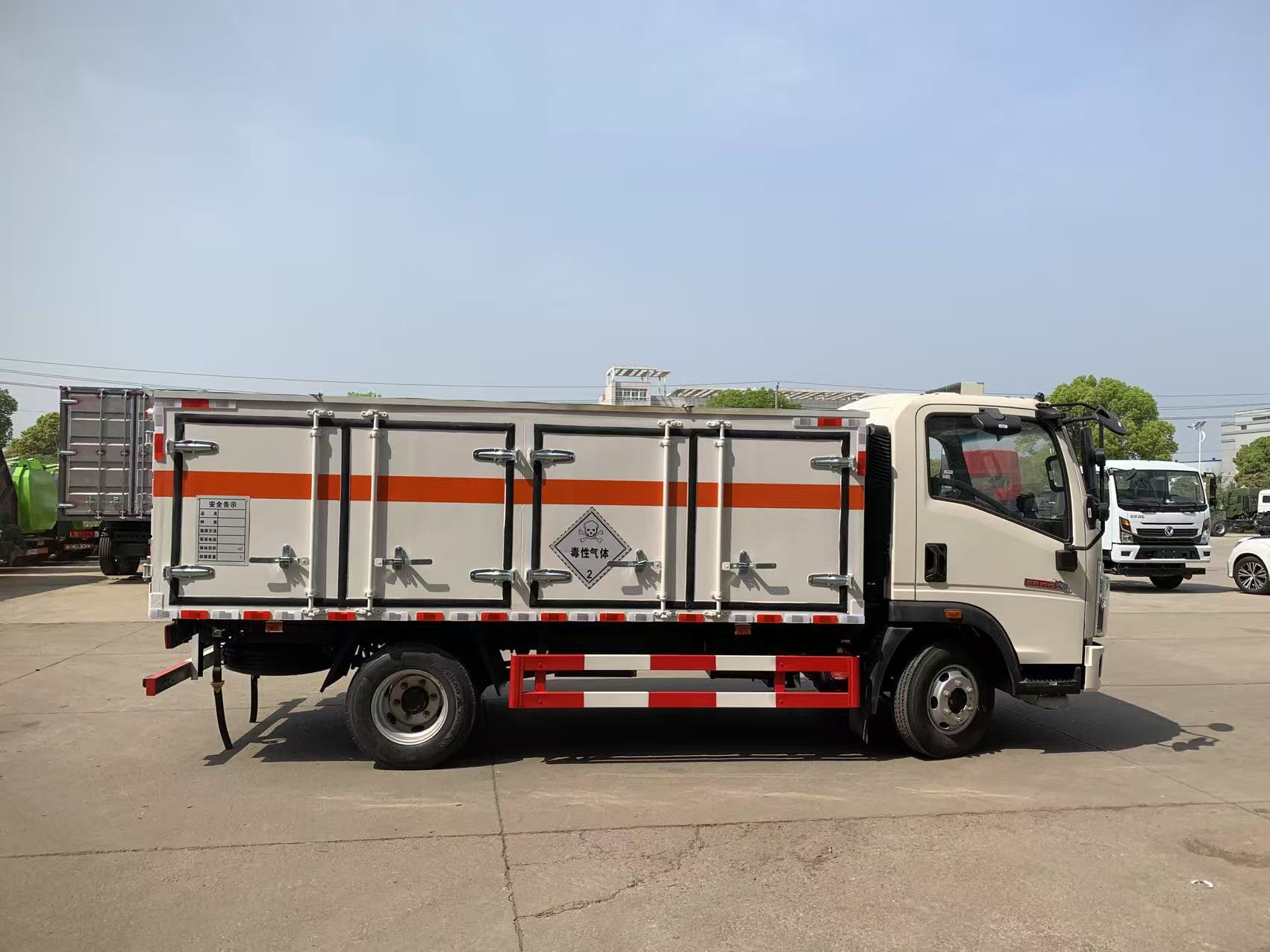 重汽豪沃國六毒性氣體廂式運輸車運輸的主要以液氯、液氨鋼瓶為主,所以箱體做的是頂部開啟樣式,不用擔心鋼瓶太重不好吊裝的問題,重汽豪沃的車型全部為您設計想到。