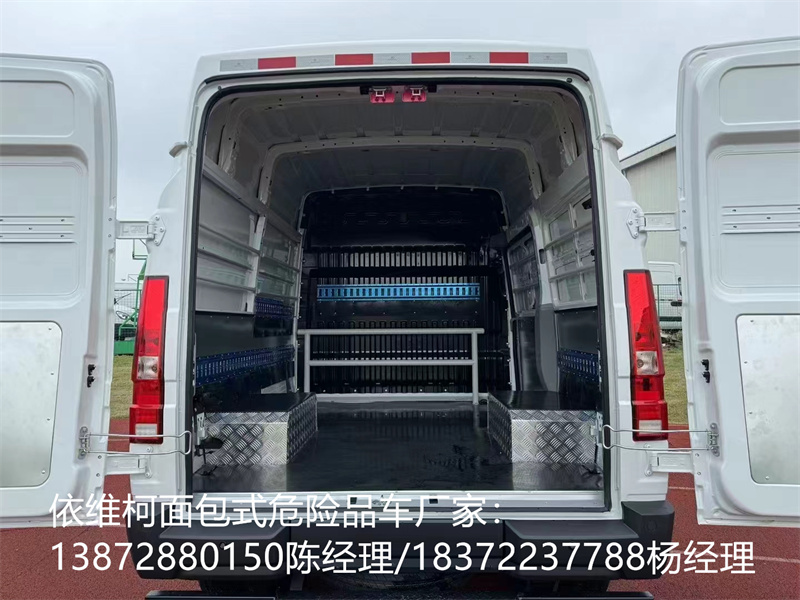 依維柯面包式易燃液體廂式車貨箱全盲窗,后門形式180度開啟雙開門,70L塑料油箱,ABS,排氣輔助制動系統,電磁式電源總開關,前霧燈,電動調節大燈,普通前大燈,前輪爆胎保險裝置,雙預警:車道偏離預警LDWS和前碰撞預警FCWS。車廂一周粘貼橙色放光帶,廂體底板上加裝綁扎環,箱體粘貼 菱形告示牌,安全告示牌,危險品牌,拖地靜電帶。