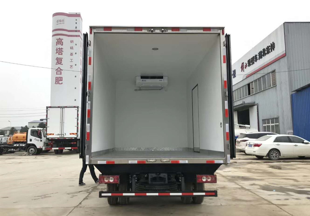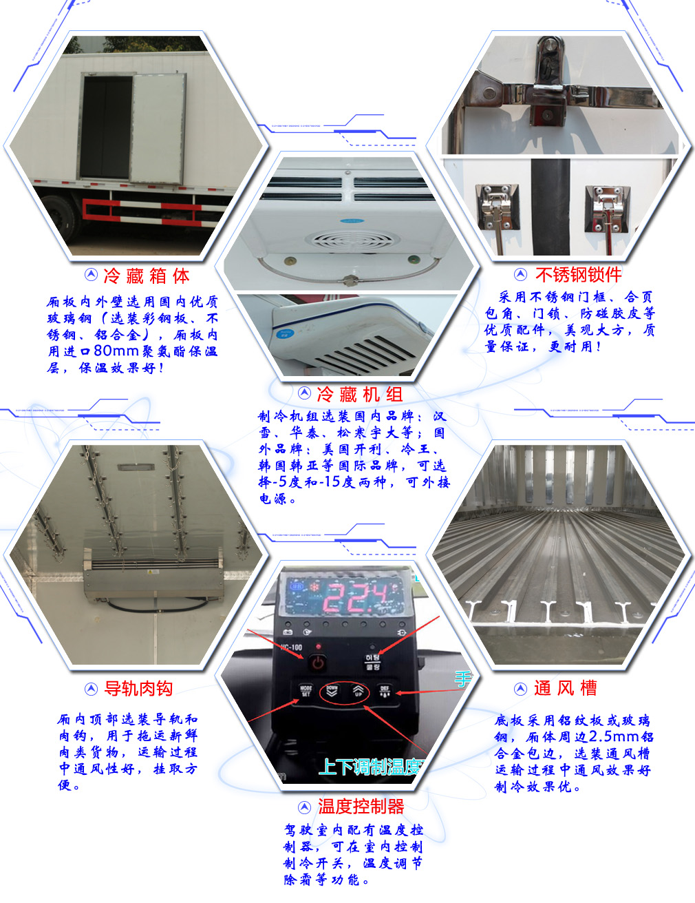 廂體配置:貨廂尺寸:3700×2350×2200/3700×2100×2000,廂體材質為內外玻璃鋼,8cm高密度聚氨酯保溫,底板為防滑花紋鋁板,后門鎖件為不銹鋼。